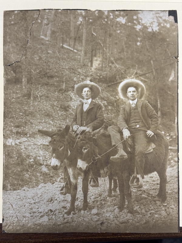 J. Verne Smith, Sr (left) and E. C. Bailey, Sr. (right) on a trip to Happy Hollow "amusement park" in Hot Springs, Arkansas, located at the end of Fountain Street, just off Central Avenue, and north of Hot Springs Mountain. They are posing for the photographer on two of the park's burros.