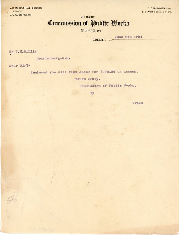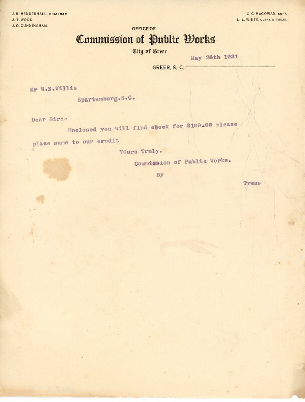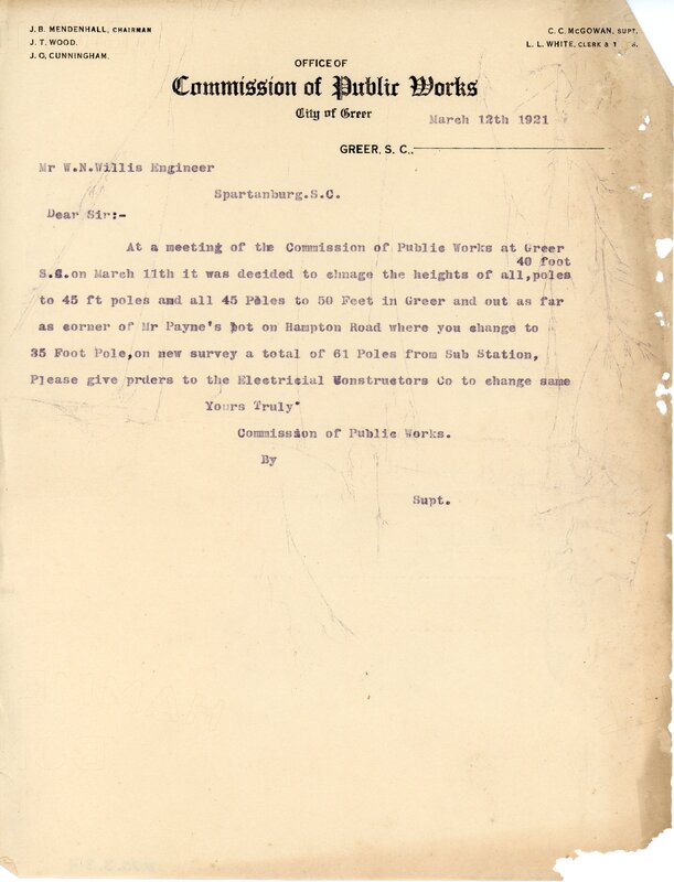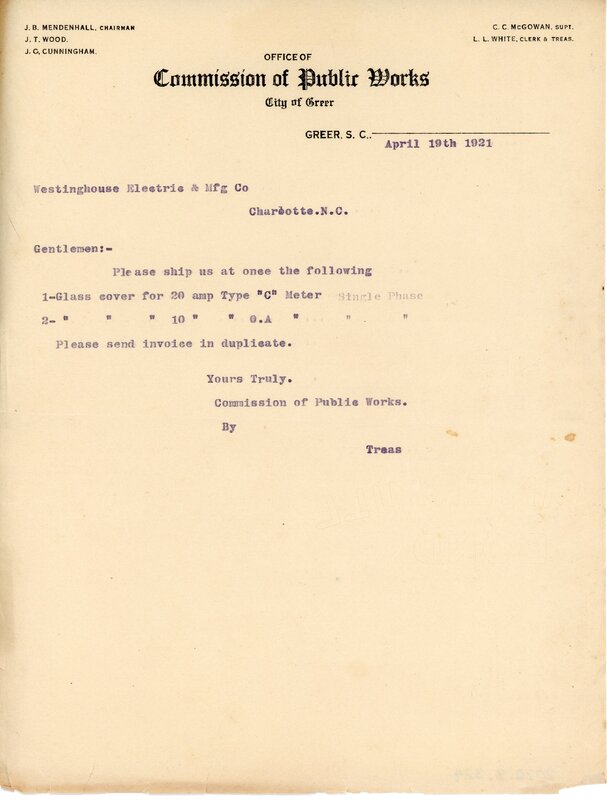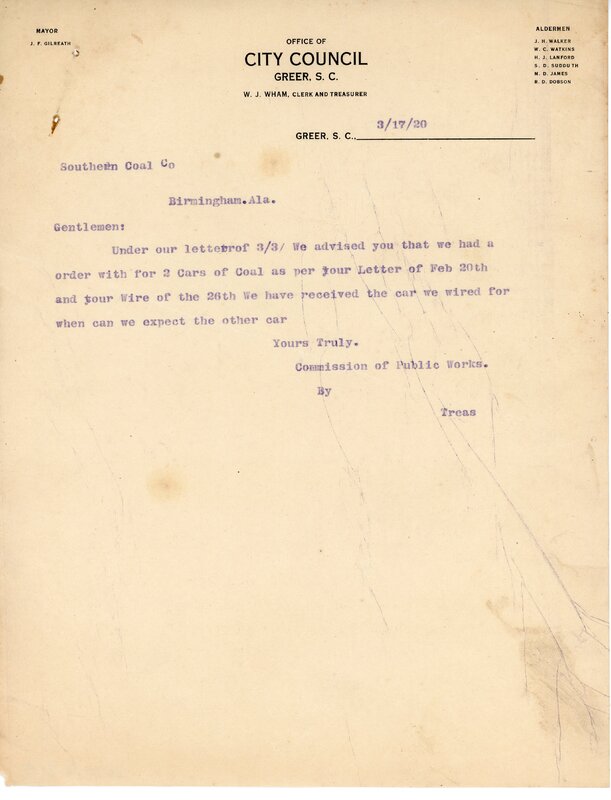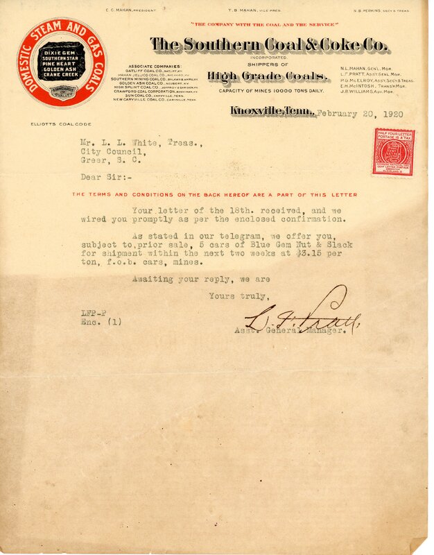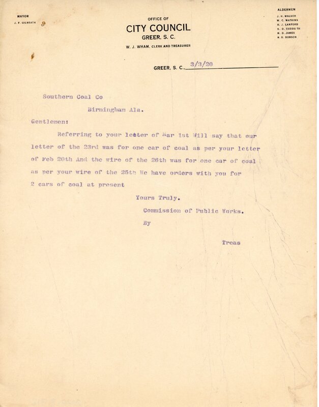 Letter 20 February 1920 Superior Coal Co. to Commission of Public Works, Greer, S. C.