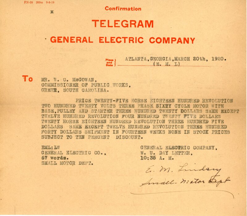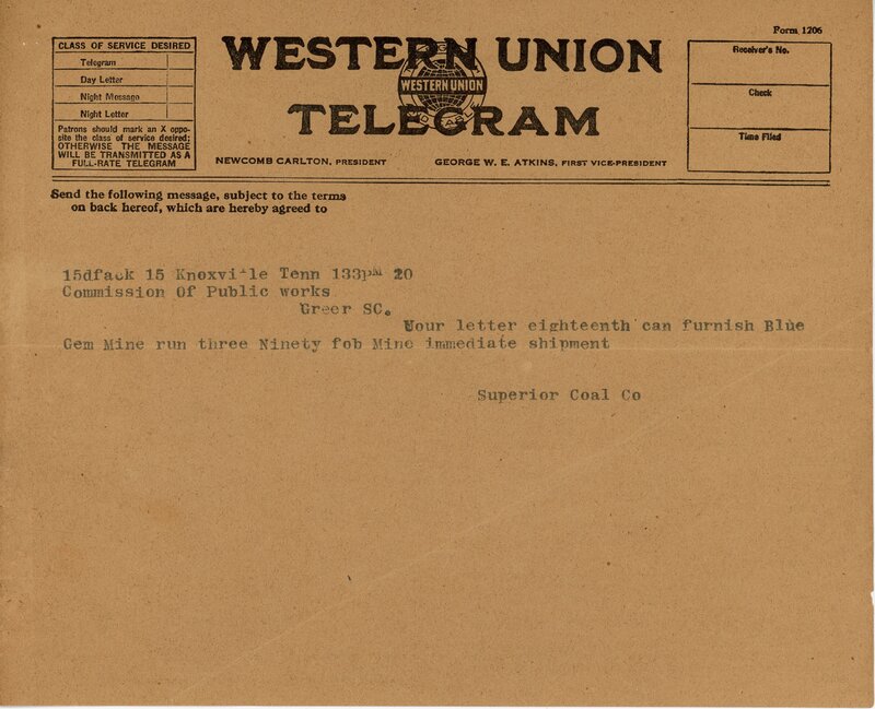 Telegram 20 February 1920 Superior Coal Co. to Commission of Public Works Greer, S. C.