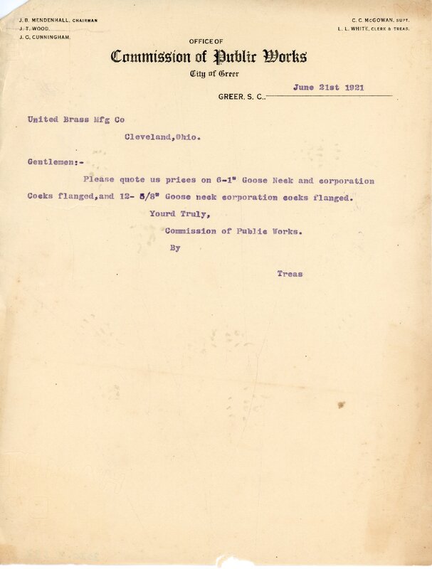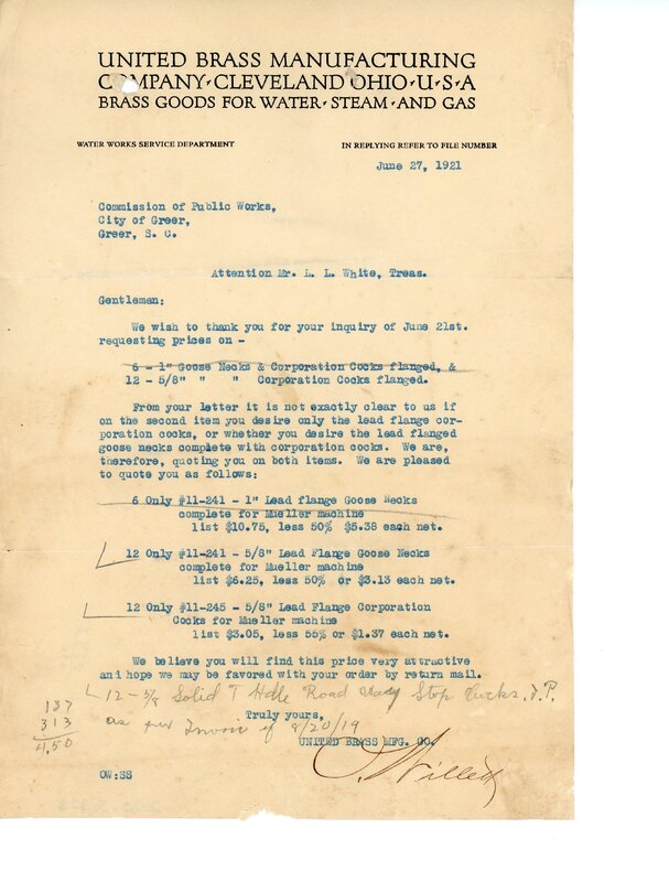 Letter 27 June 1921 United Brass Manufacturing Co. to Commission of Public Works Attention L. L. White