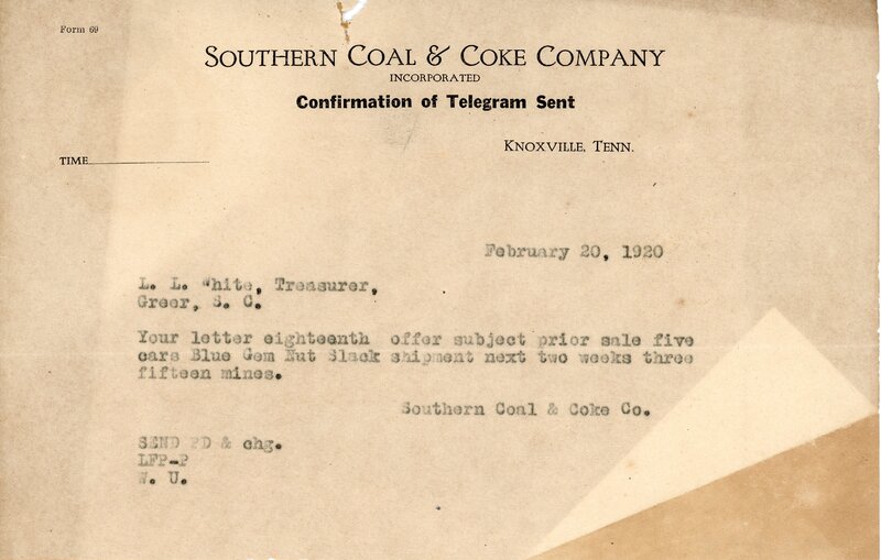 Confirmation of Telegram Sent 20 February 1920 Southern Coal & Coke Co. to L. L. White
