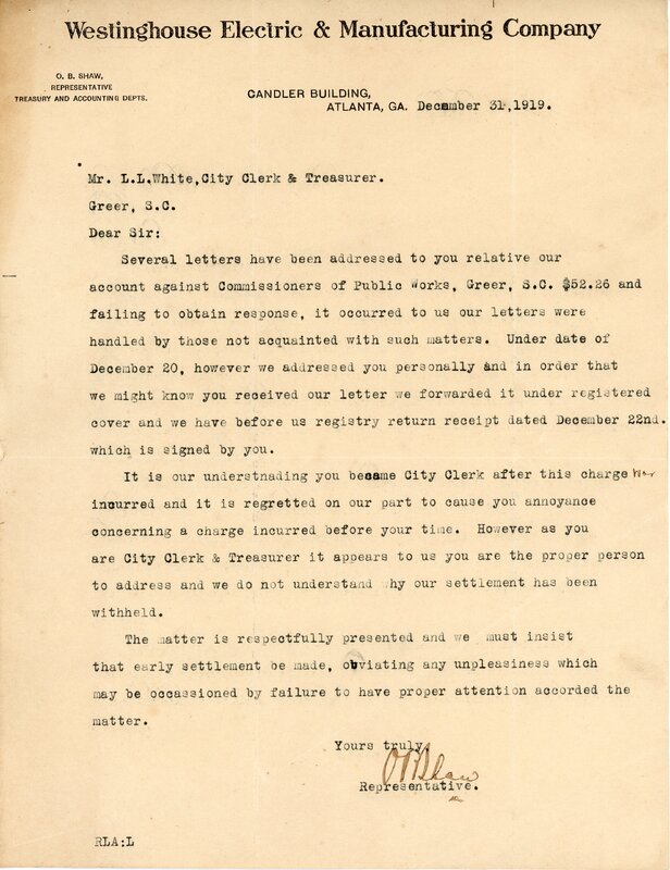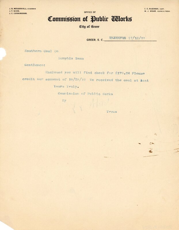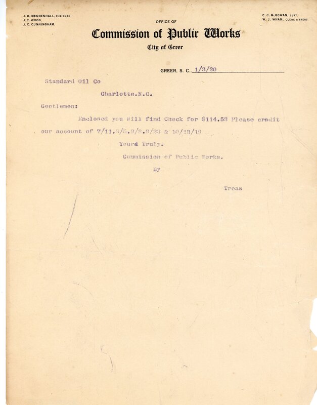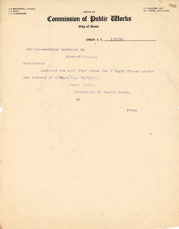Letter 20 February 1920 B. R. Smith to Commission of Public Works, Greer, S. C. Attention L. L. White