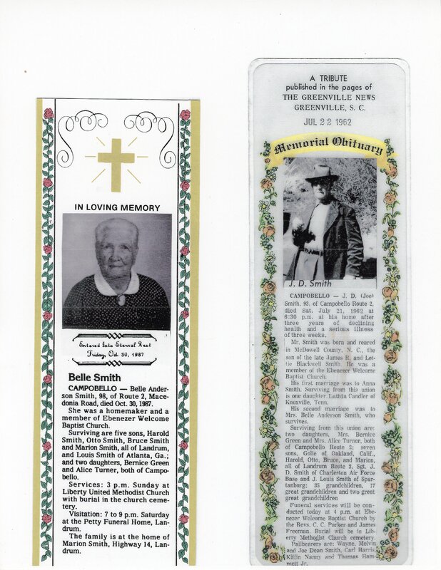 Photocopy of the obituaries of Mr. J.D. Smith and his wife, Mrs. Belle Smith