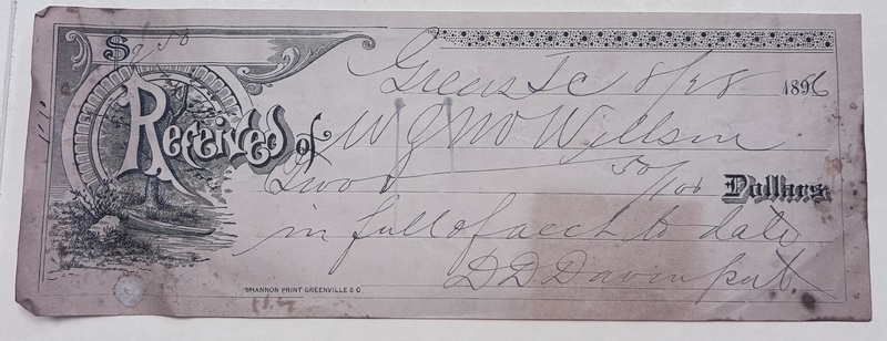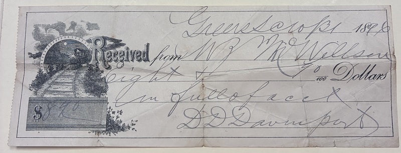 Check from D.D Davenport to W.Z.M Willson, August 1896