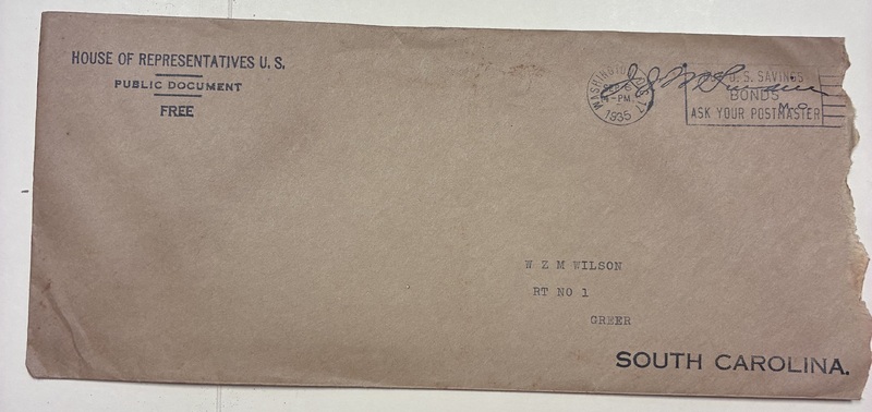Envelop from House of Representatives U.S. Letter from J.J. McSwain, M.C., 4th District, South Carolina regrading Agricultural Yearbooks