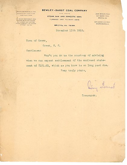 - Letter 11 November 1915 G. Darst to Town of Greer, Greer, S. C.