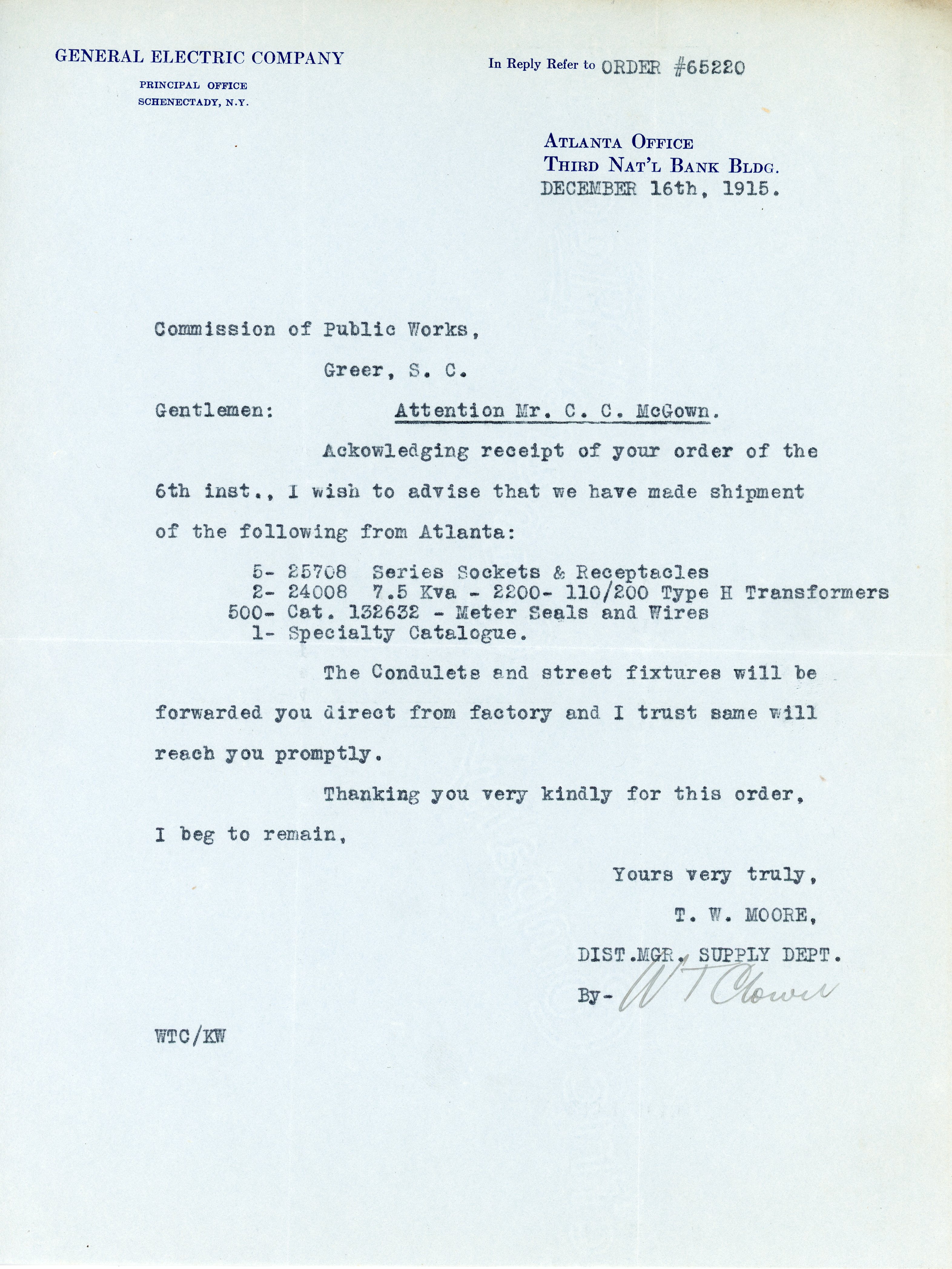 Letter 16 December 1915 T. W. Moore by W. T. C. to Commission of Public Works to C. C. McGown