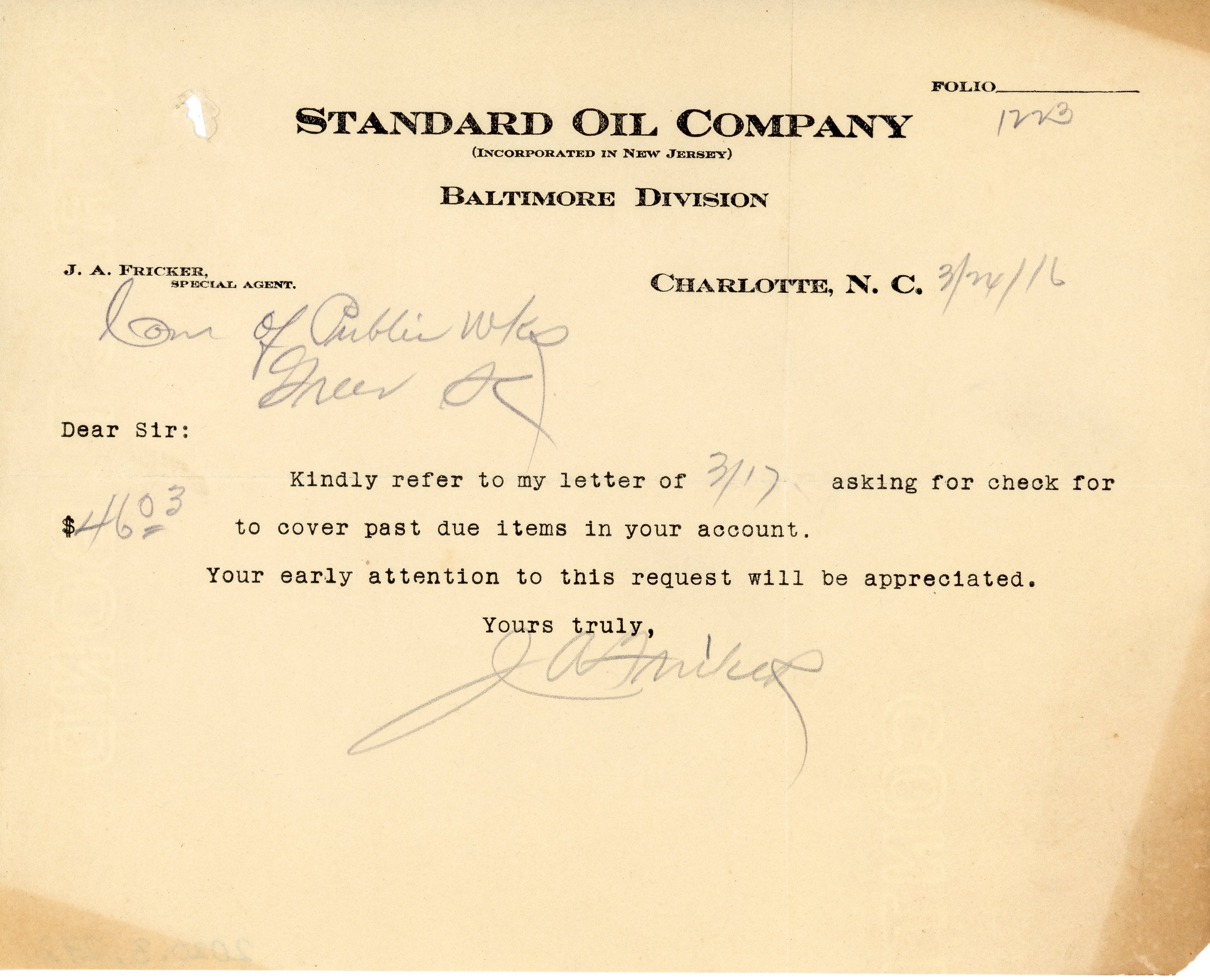- Letter 24 March 1916 J. A. Fricker to Commission of Public Works, Greer, S. C.