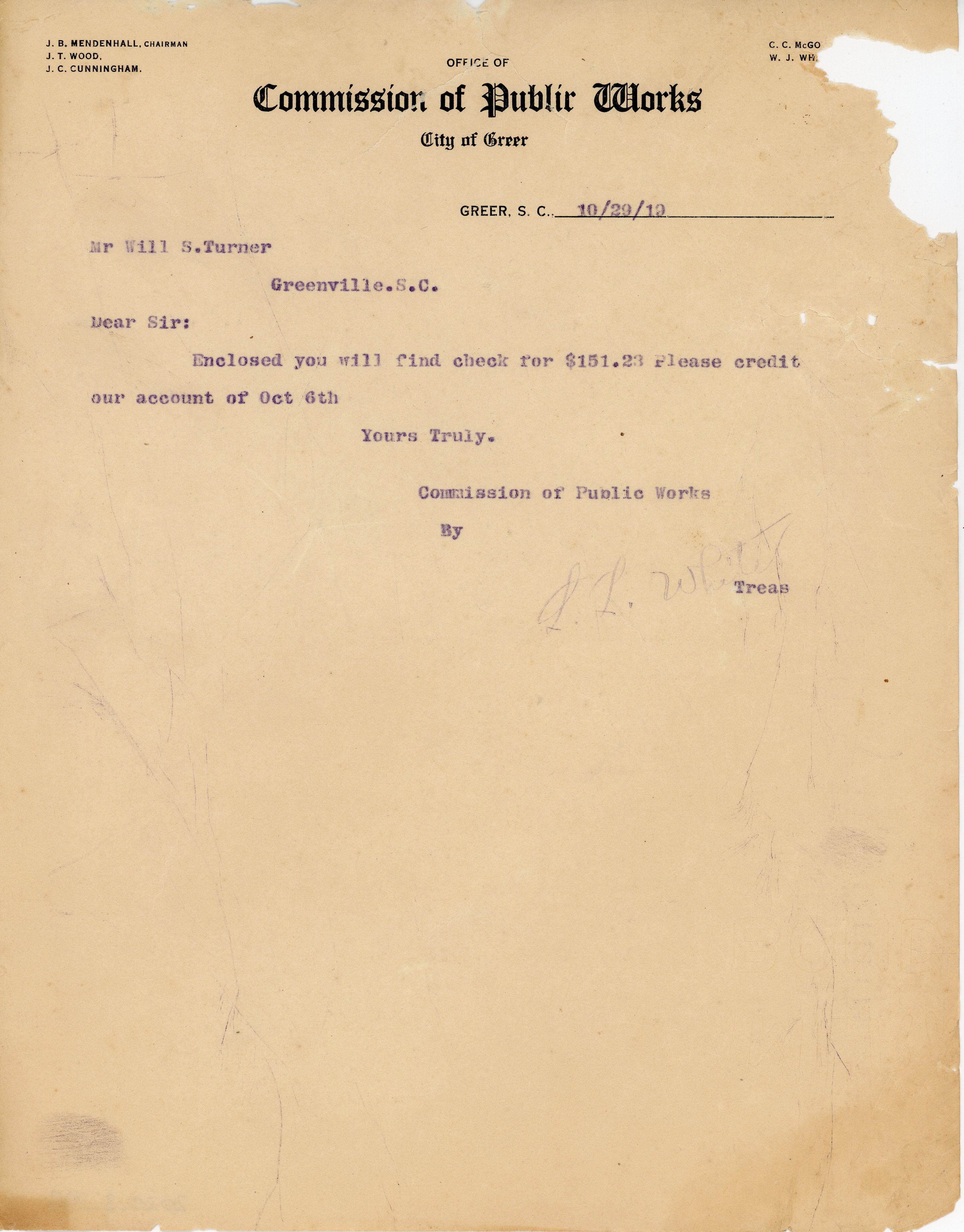 Letter 29 October 1919 W. J. Wham to W. S. Turner