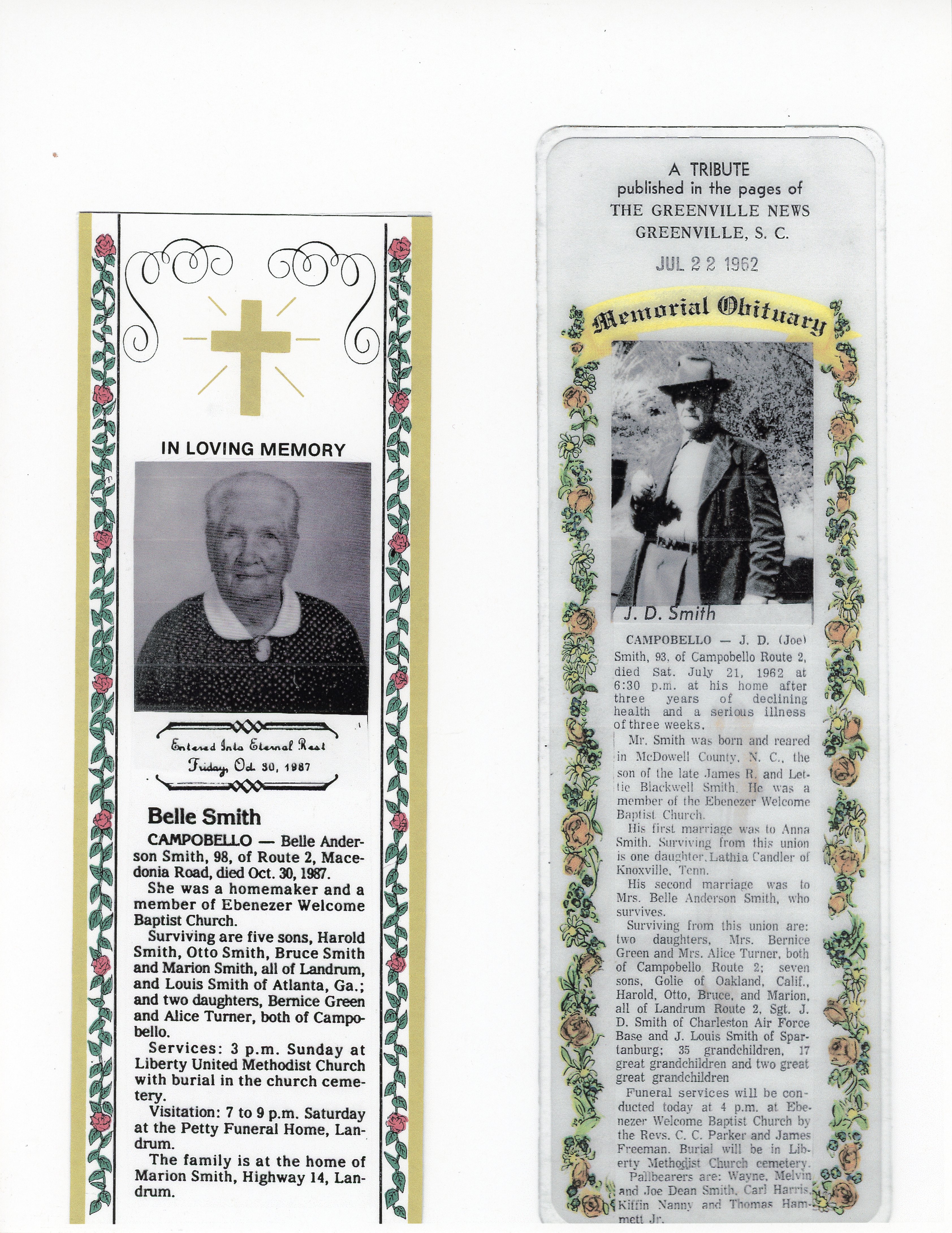 - Photocopy of the obituaries of Mr. J.D. Smith and his wife, Mrs. Belle Smith