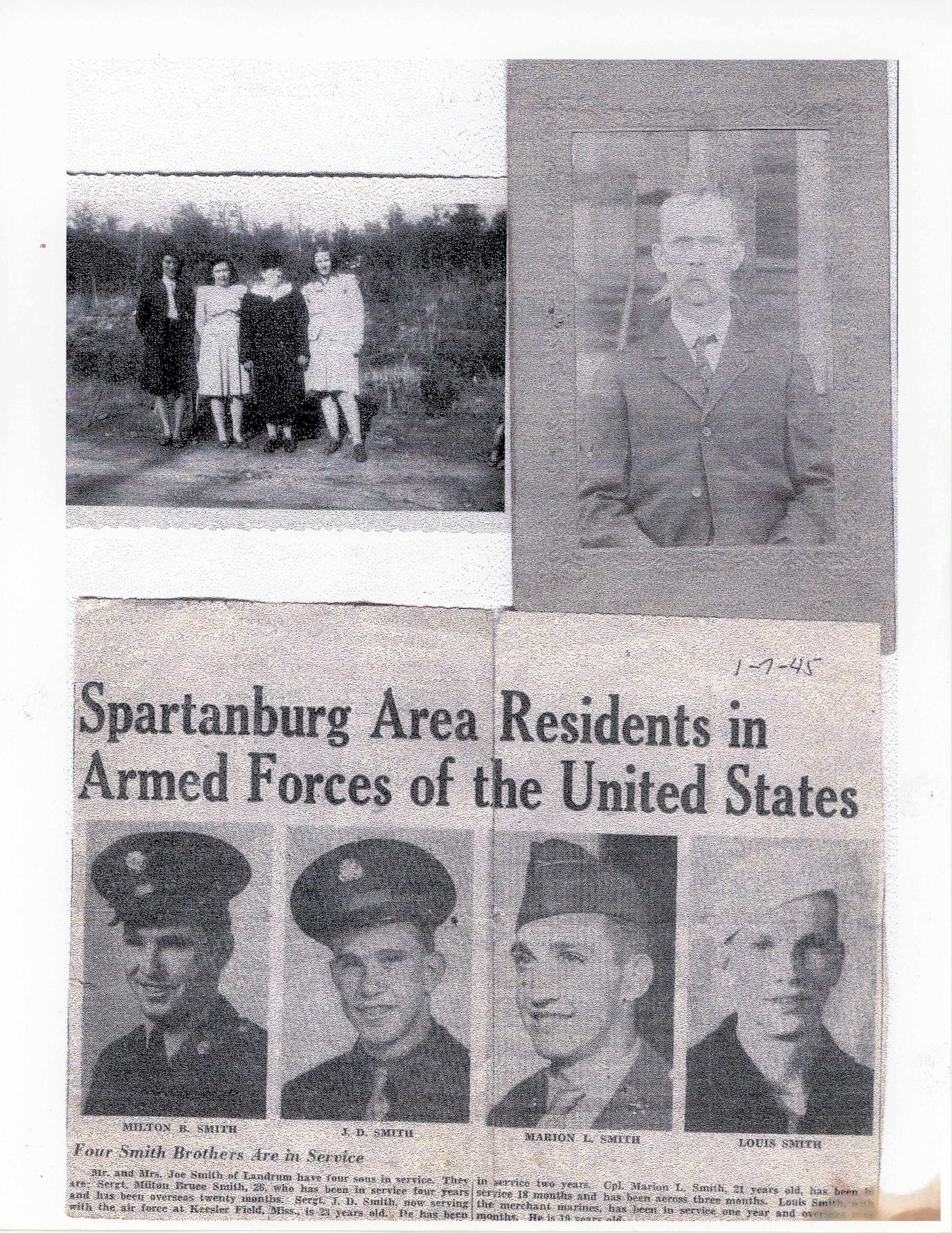 Mr. and Mrs. Joe Smith of Landrum have four sons in service. They are Sergt. Milton Bruce Smith, 26, who has been in service four years and has been overseas twenty months. Sergt. J.D. Smith, now serving with the air force at (illegible) Field, Miss., is 23 years old. He has been in service two years. Cpl. Marion L. Smith, 21 years old, has been in service 18 months and has been across three months. Louis Smith with the merchant marines, has been in service one year and overseas (illegible) months. He is (illegible) years old.
