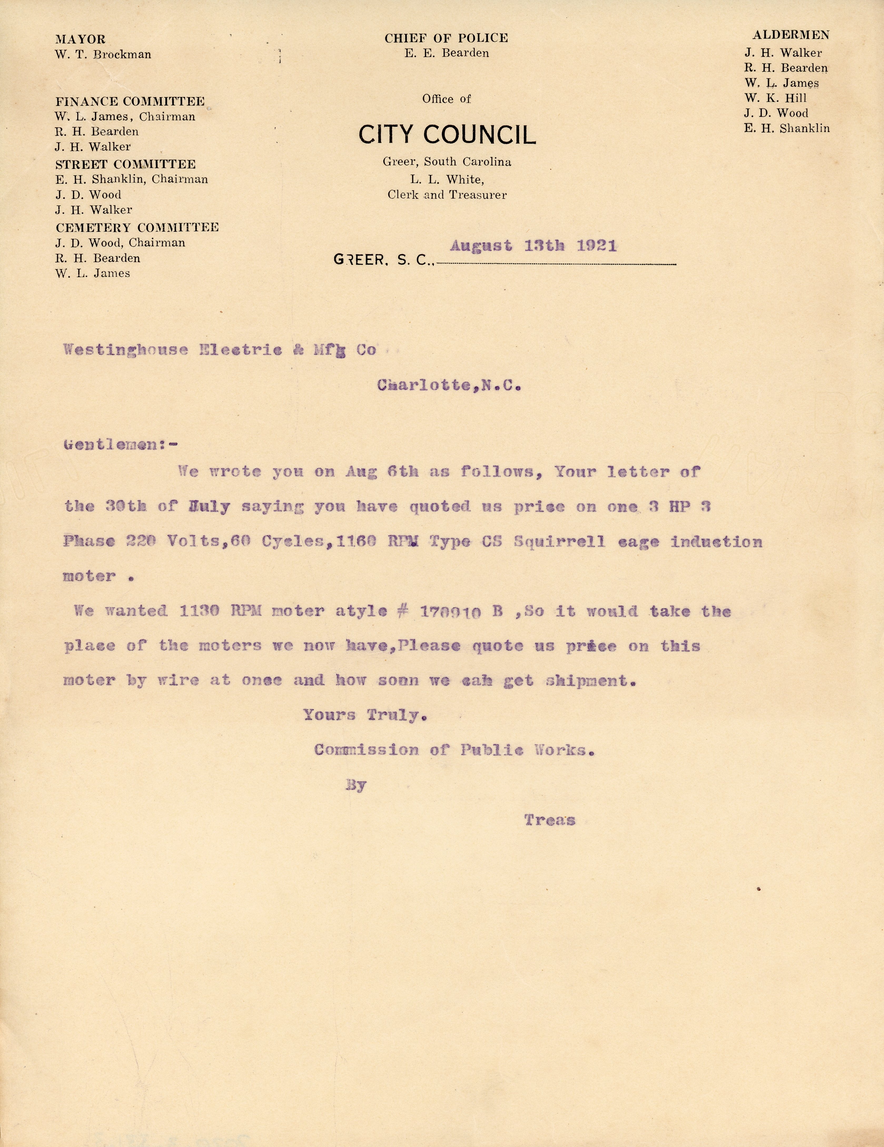 - Letter 13 August 1921 L. L. White to Westinghouse Electric & Manufacturing Co.
