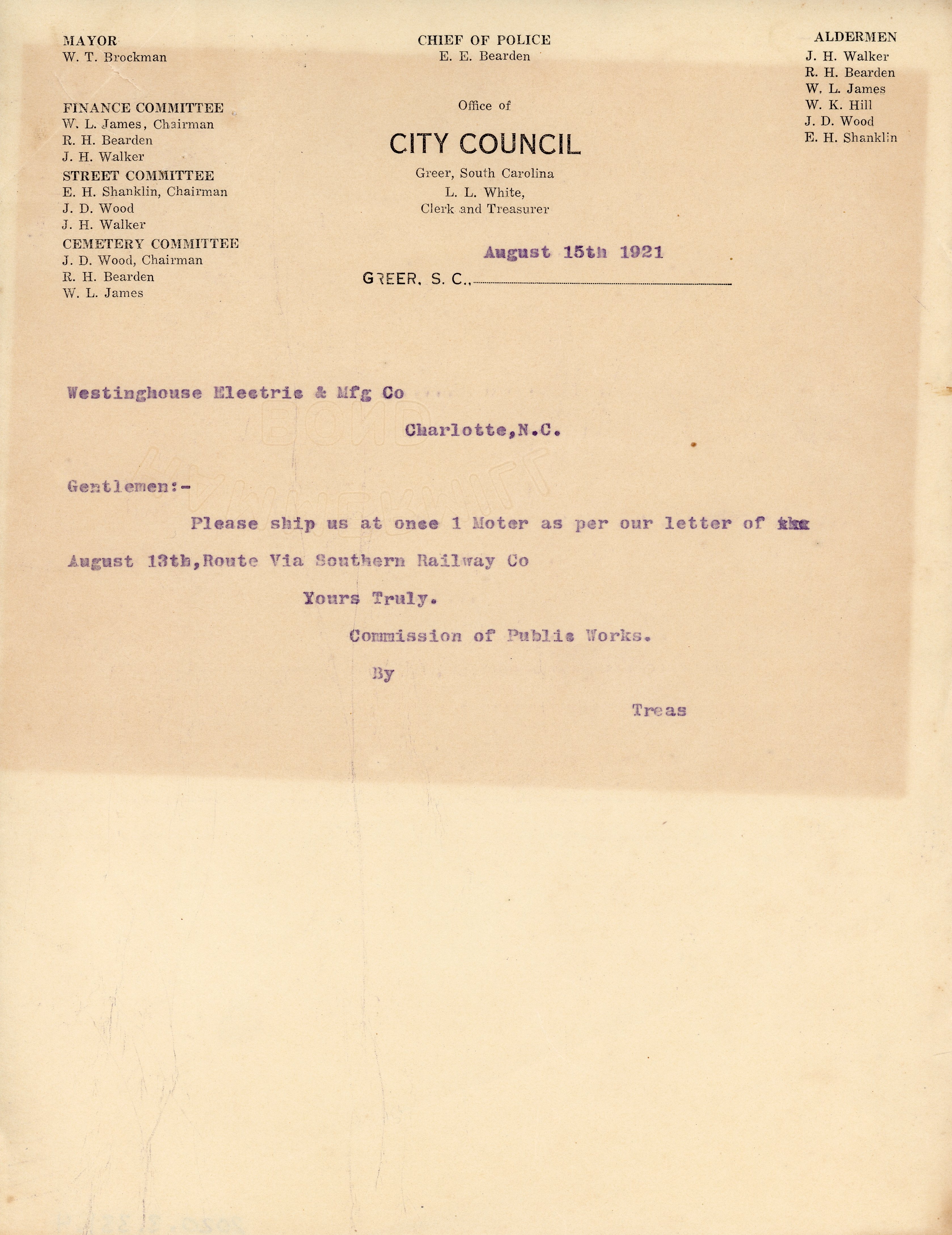 - Letter 15 August 1921 L. L. White to Westinghouse Electric & Manufacturing Co.