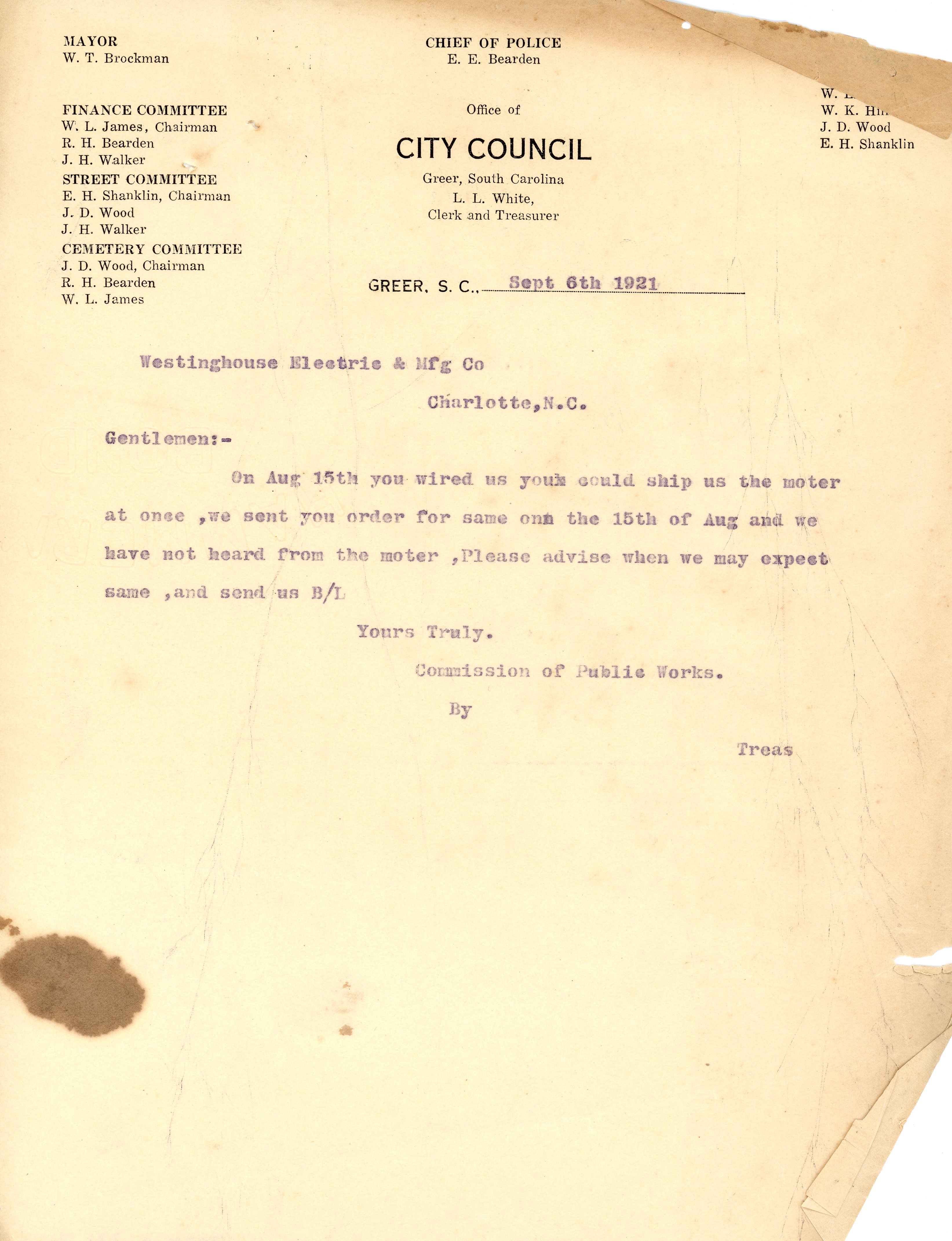 - Letter 6 September 1921 L. L. White to Westinghouse Electric & Manufacturing Co.