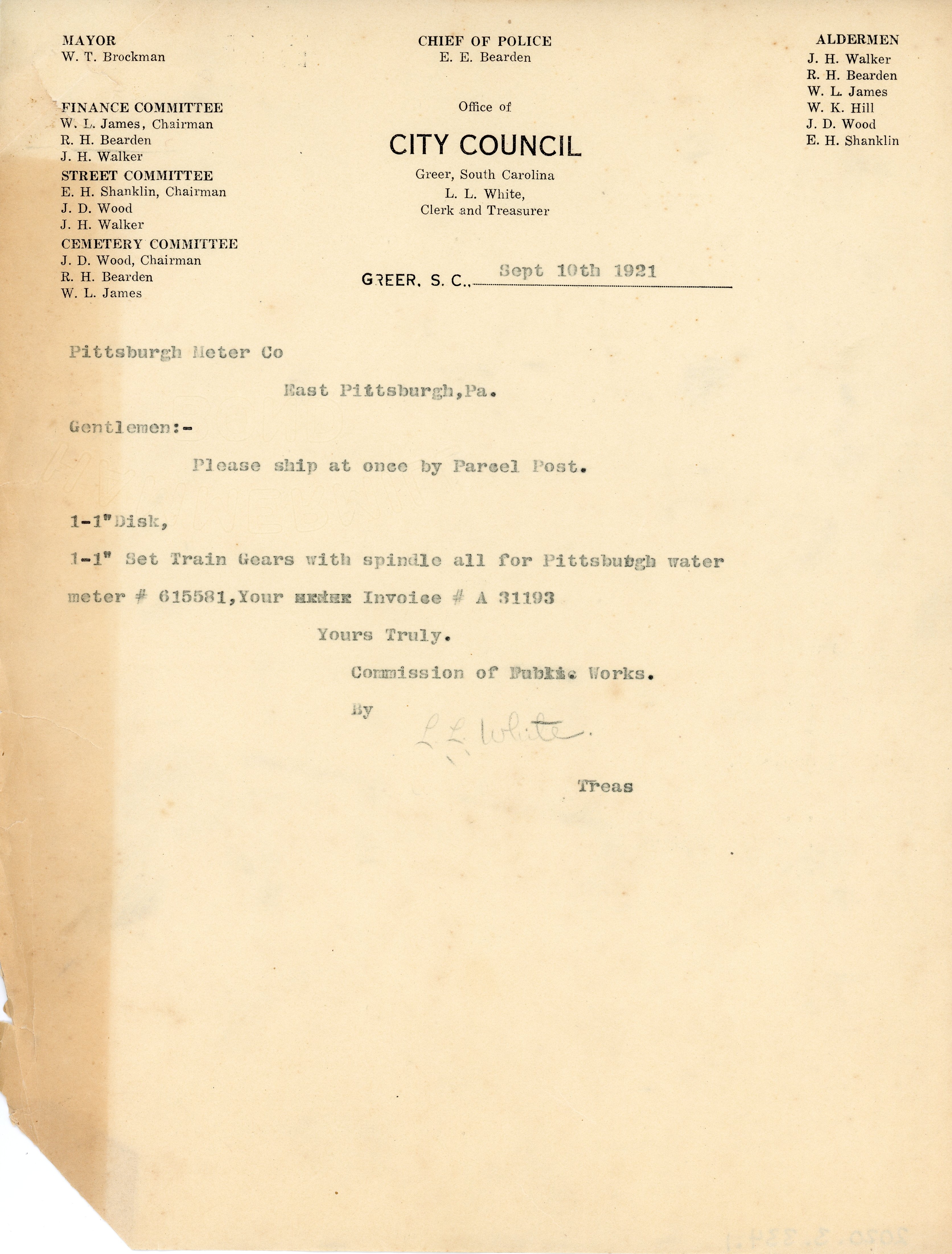 - Letter 10 September 1921 L. L. White to Pittsburgh Meter Co.