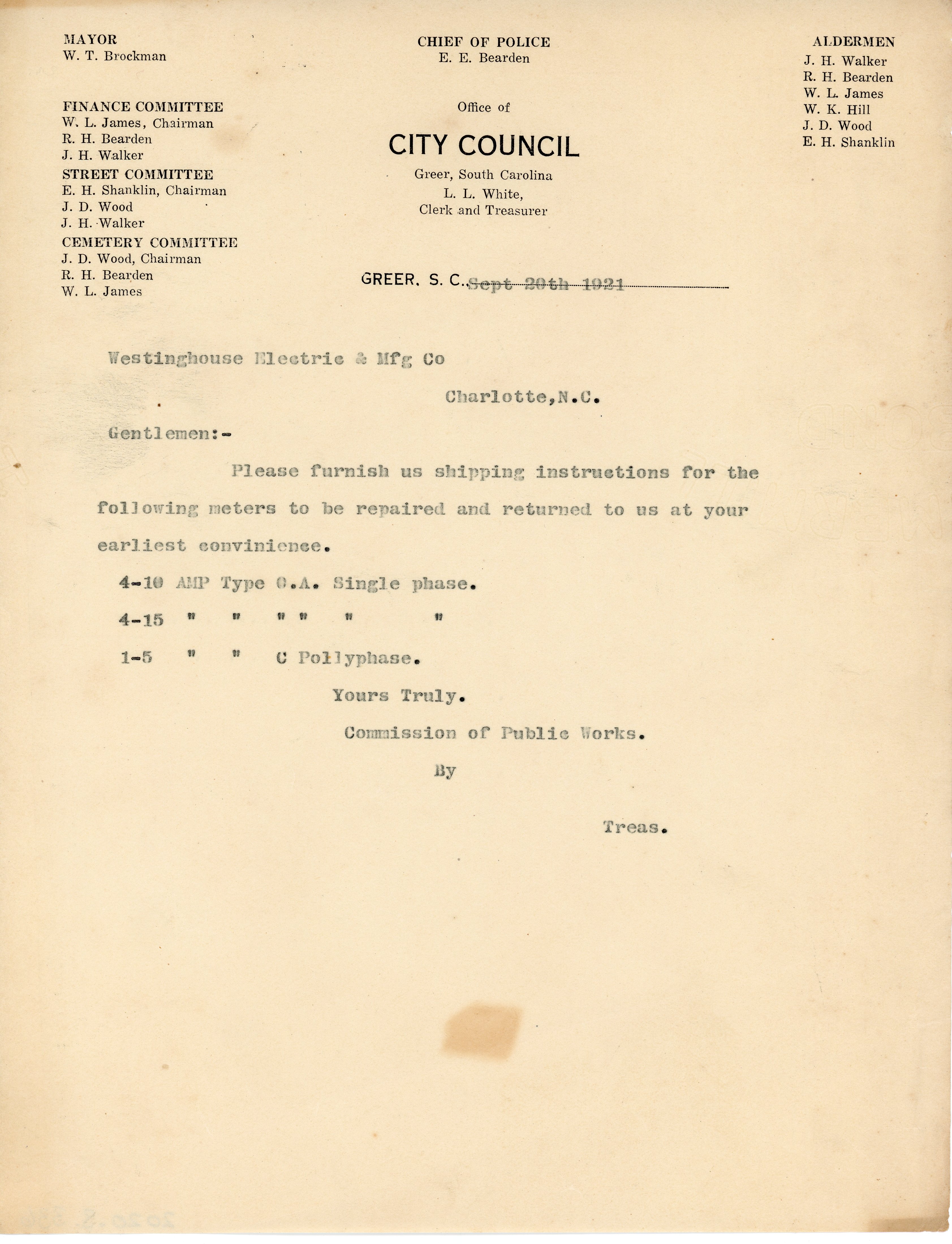 - Letter 20 September 1921 L. L. White to Westinghouse Electric & Manufacturing Co.