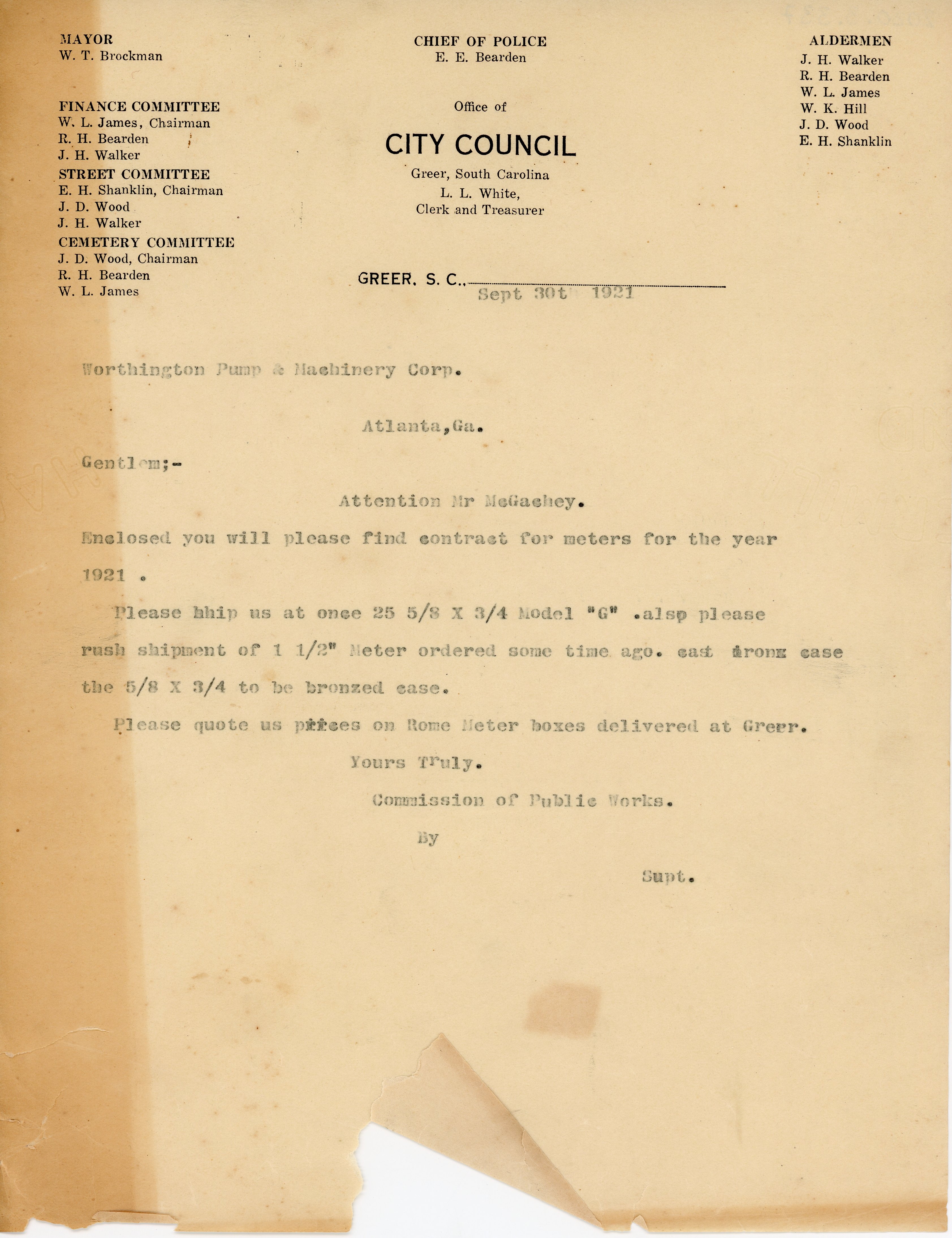 - Letter 30 September 1921 Commission of Public Works to Worthington Pump & Machinery Corp.