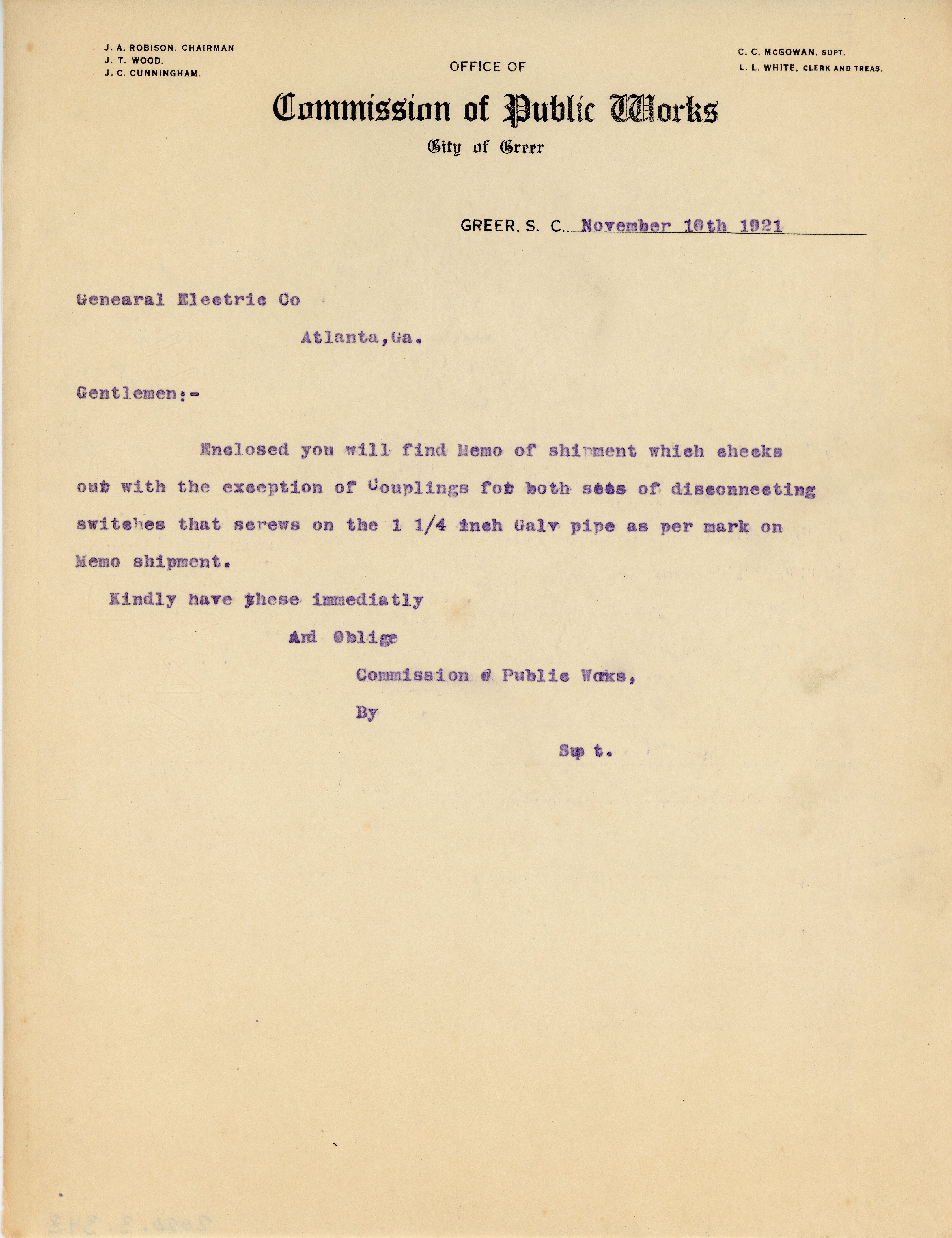 - Letter 10 November 1921 C. C. McGowan to General Electric Co.