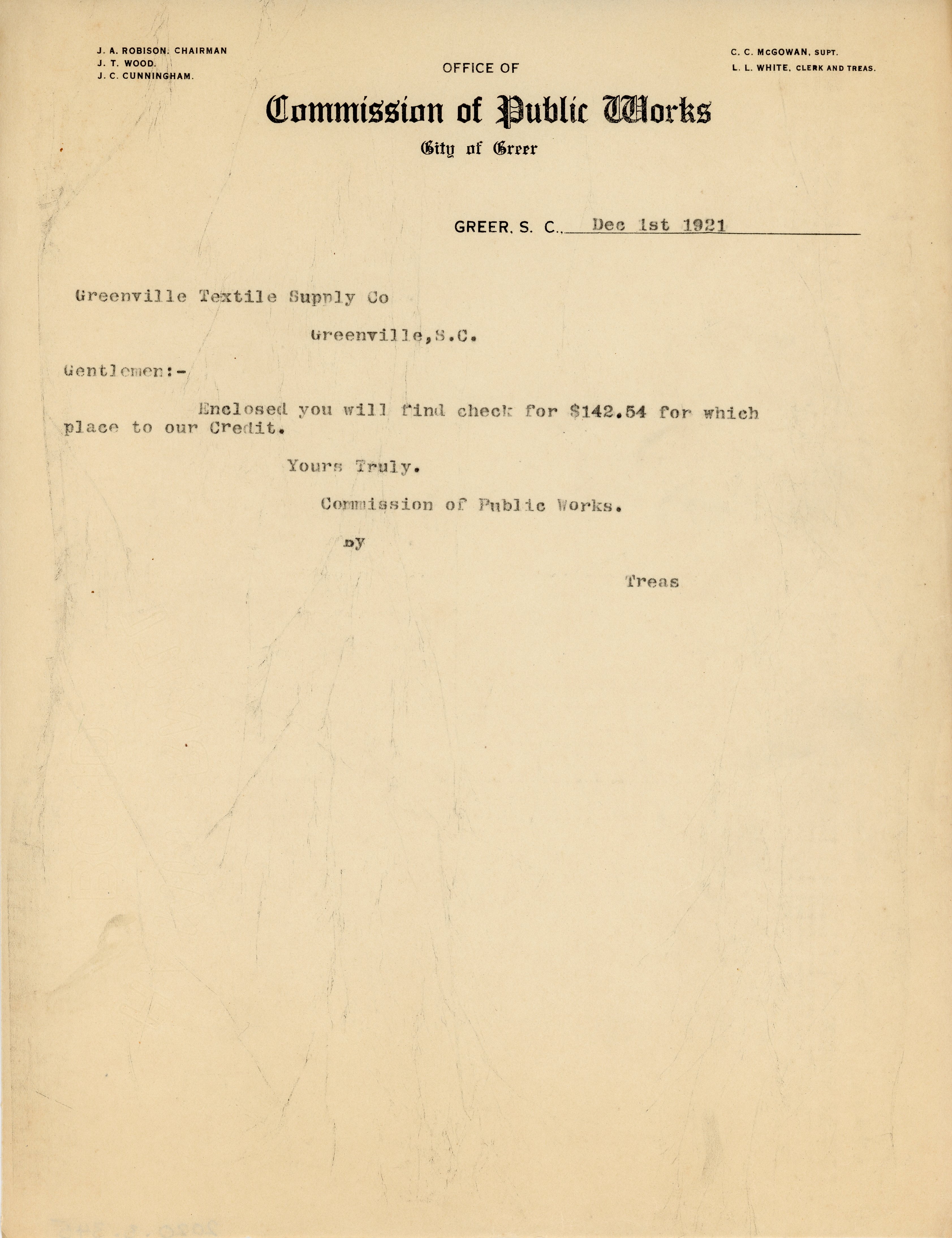 - Letter 1 December 1921 C. C. McGowan to Greenville Textile Supply Co.
