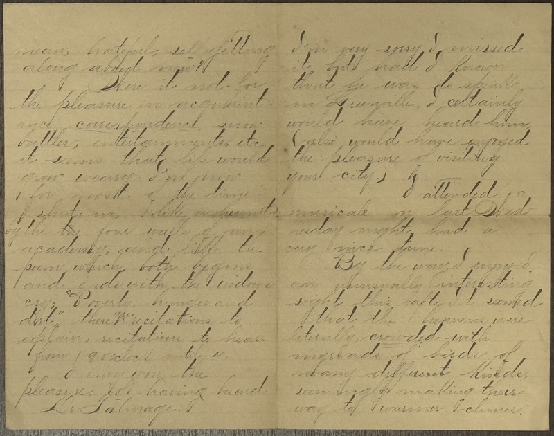 I envy you the pleasure of having heard Dr. Talmage. I'm very sorry I missed it but had I known that he was to speak in Greenville, I certainly would have heard him, also would have enjoyed the pleasure of visiting your city.