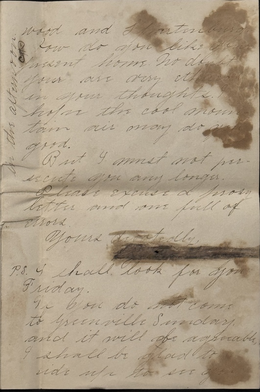 P.S. I shall look for you Friday. If you do not come to Greenville Sunday, and it will be agreeable, I shall be glad to ride up to see you in the afternoon.