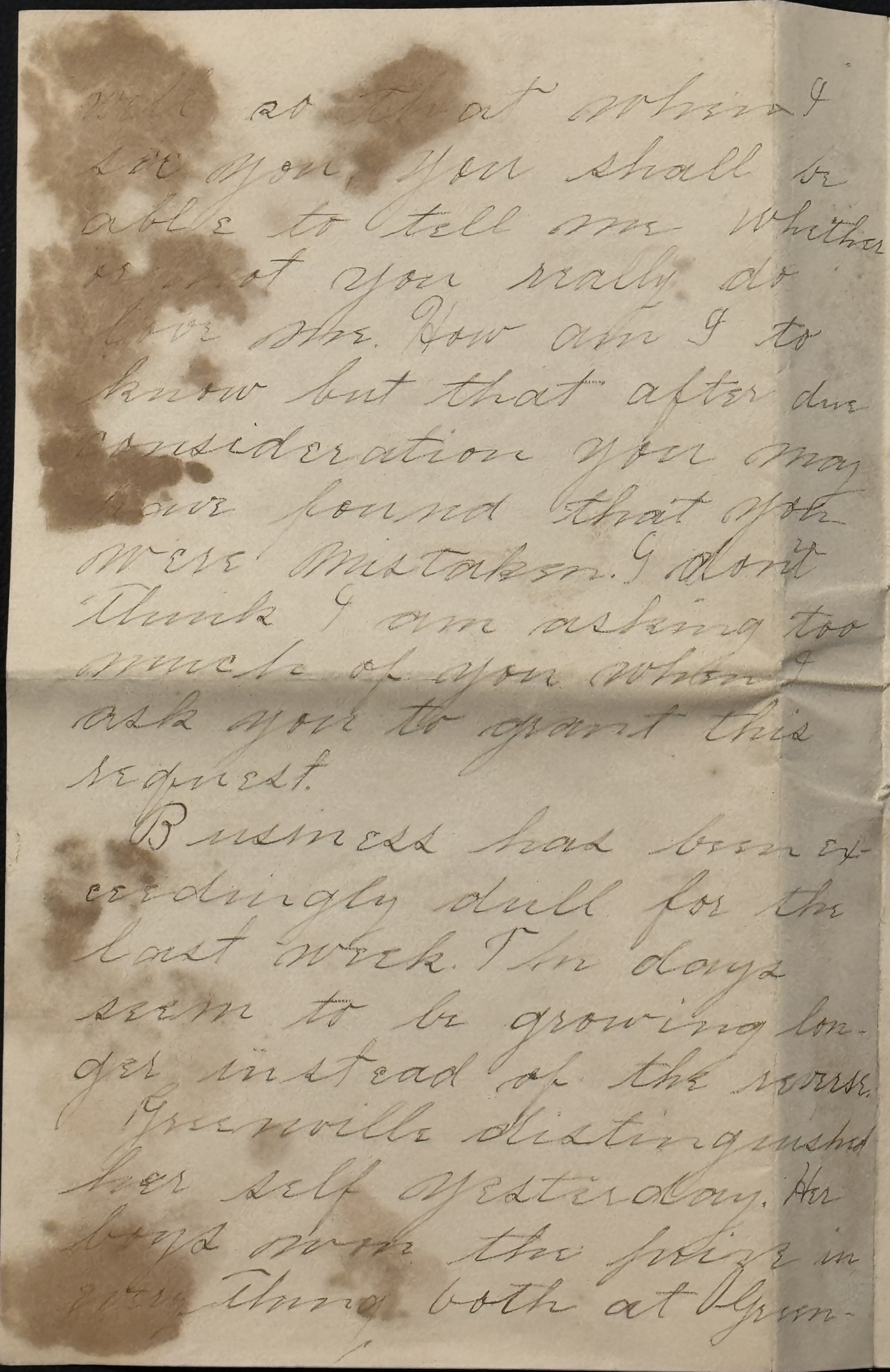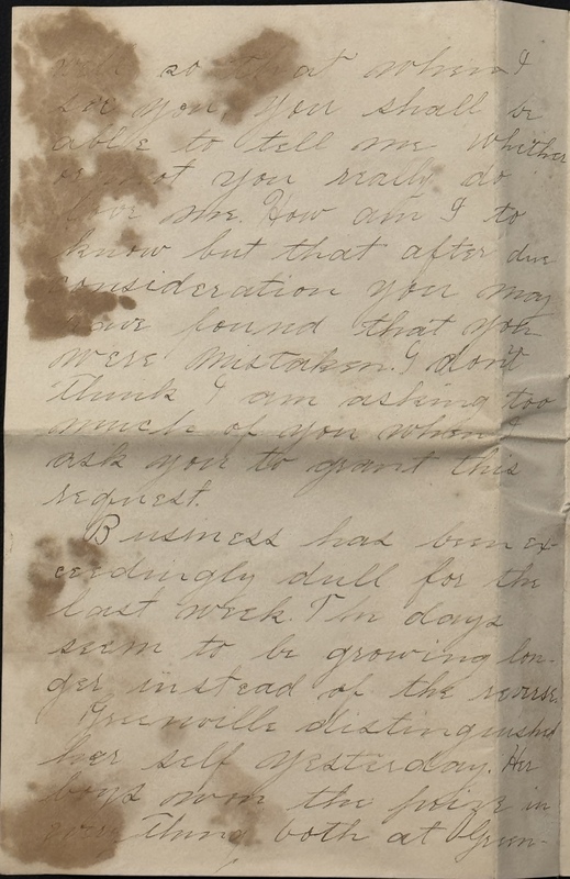 Business has been exceedingly dull for the last week. The days seem to be growing longer instead of the reverse. Greenville distinguished her self yesterday. Her boys won the prize in everything both at Greenwood and Spartanburg. How do you like your present home. No doubt you are very ethereal in your thoughts. I hope the cool mountain air may do you good.