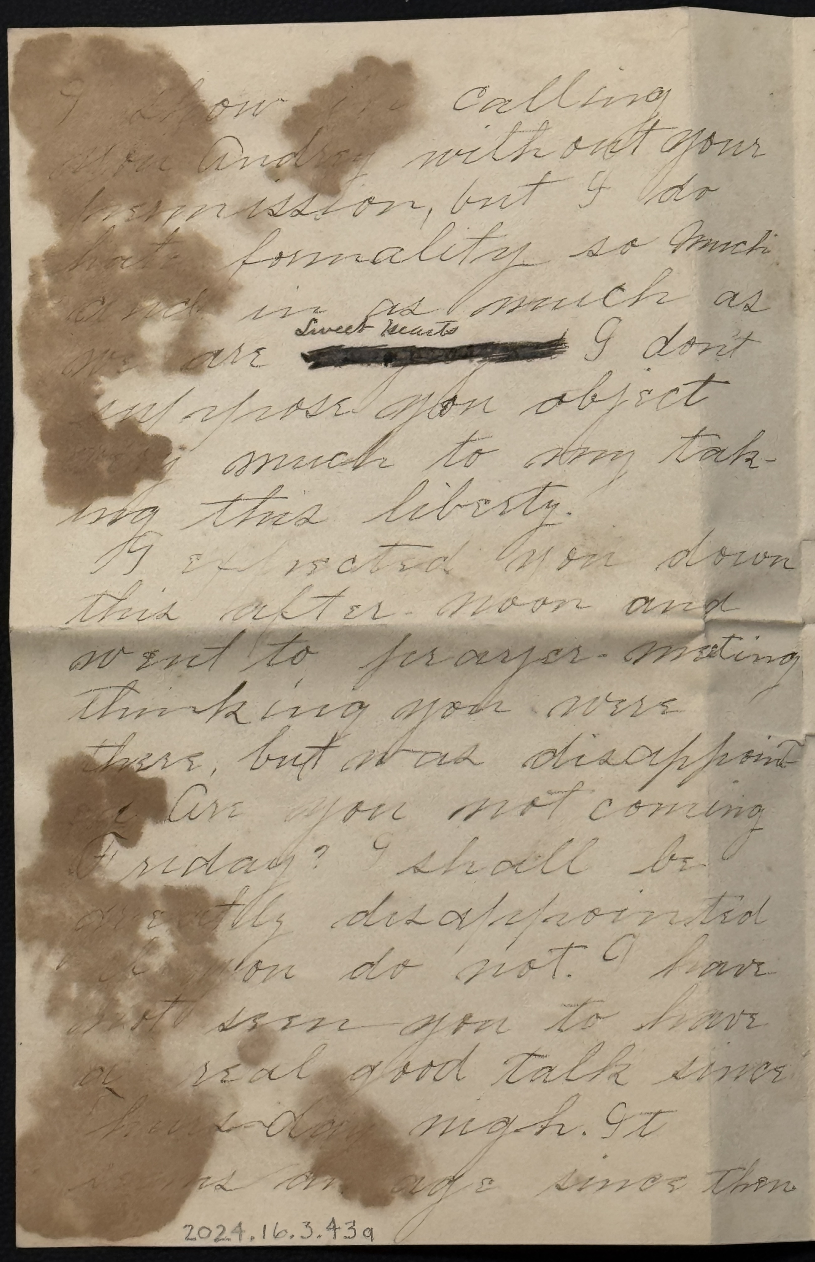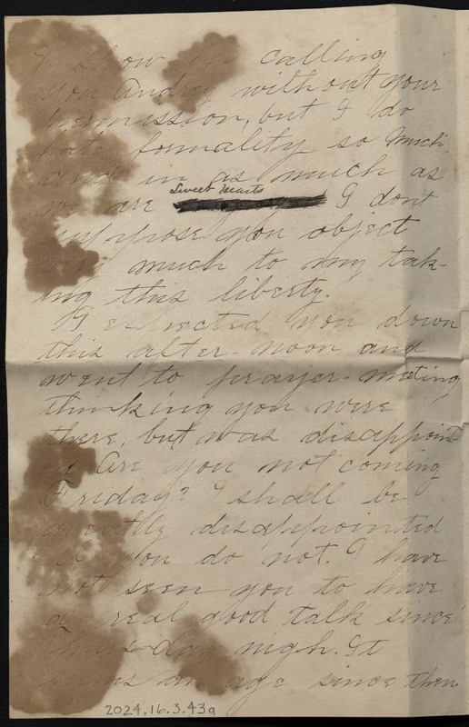 Please excuse the apparent presumption I show in calling you Audrey without your permission, but I do hate formality so much and in as much as we are [ illegible words, heavily blacked out with ink; appears to be two words, each with a looped descender in the middle. Written above, in Audrey's hand, "Sweet Hearts"] I don't suppose you object very much to my taking the liberty.