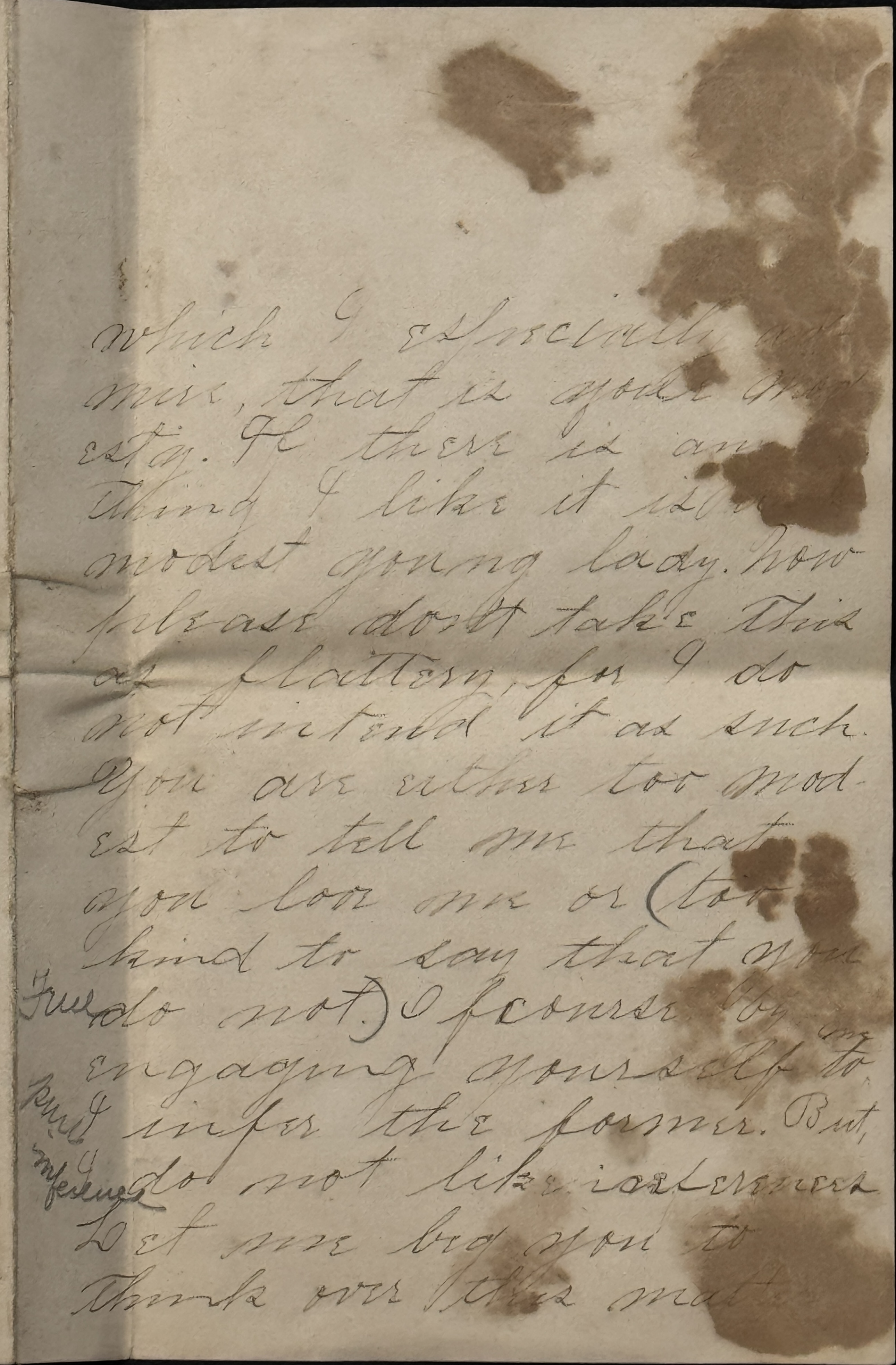 There is one of your many good qualities which I especially admire, that is your modesty. If there is anything I like it is a modest young lady. Now please don't take this as flattery, for I do not intend it as such. You are either too modest to tell me that you love me or too kind to say that you do not. [Audrey has penciled parentheses around "too kind to say that you do not," and written beside it "True."] Of course by engaging yourself to me I infer the former. [Audrey has penciled beside this "pure inference."] But, I do not like inferences. Let me beg you to think over this matter well so that when I see you, you shall be able to tell me whether or not you really do love me. How am I to know but that after due consideration you may have found that you were mistaken. I don't think I am asking too much of you when I ask you to grant this request.