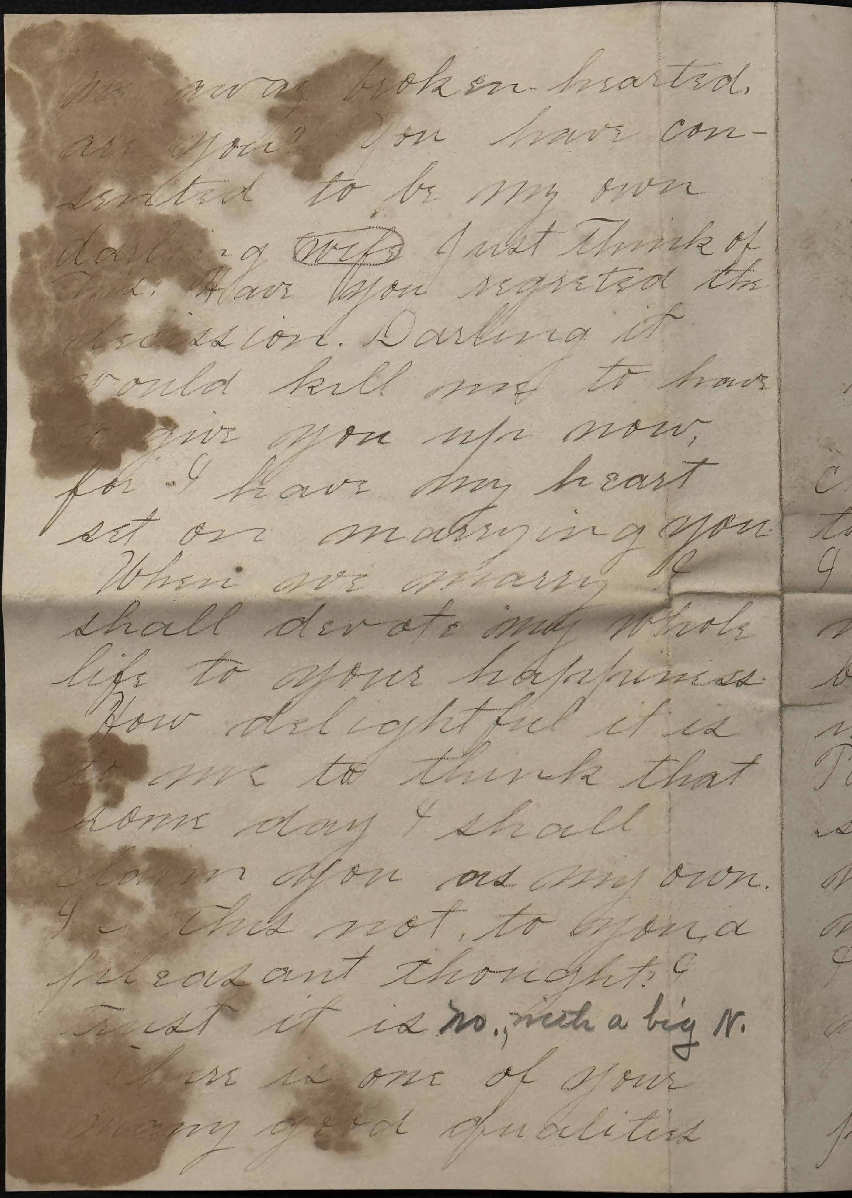 My dearest, as I have told you before, I love you with all the intensity of my nature. I long to tell you of this love which is consuming me, but words fail utterly to accomplish my purpose. Believe me when I say that you are the only woman on Earth I love, for god knows I am telling the truth. I shall never love another as I love you. With you all things are possible, without you life is a failure. Truly my future destiny is in your hands. You are not willing to turn me away broken-hearted, are you? You have consented to be my own darling wife. ["wife" has been circled in pencil separately, added by Audrey later.] Just think of this: Have you regretted the decission. Darling it would kill me to have to give you up now, for I have my heart set on marrying you. When we marry I shall devote my whole life to your happiness. How delightful it is to me to think that some day I shall claim you as my own. Is this not, to you, a pleasant thought? I trust it is. [Written in pencil by Audrey: "No., with a big N."]