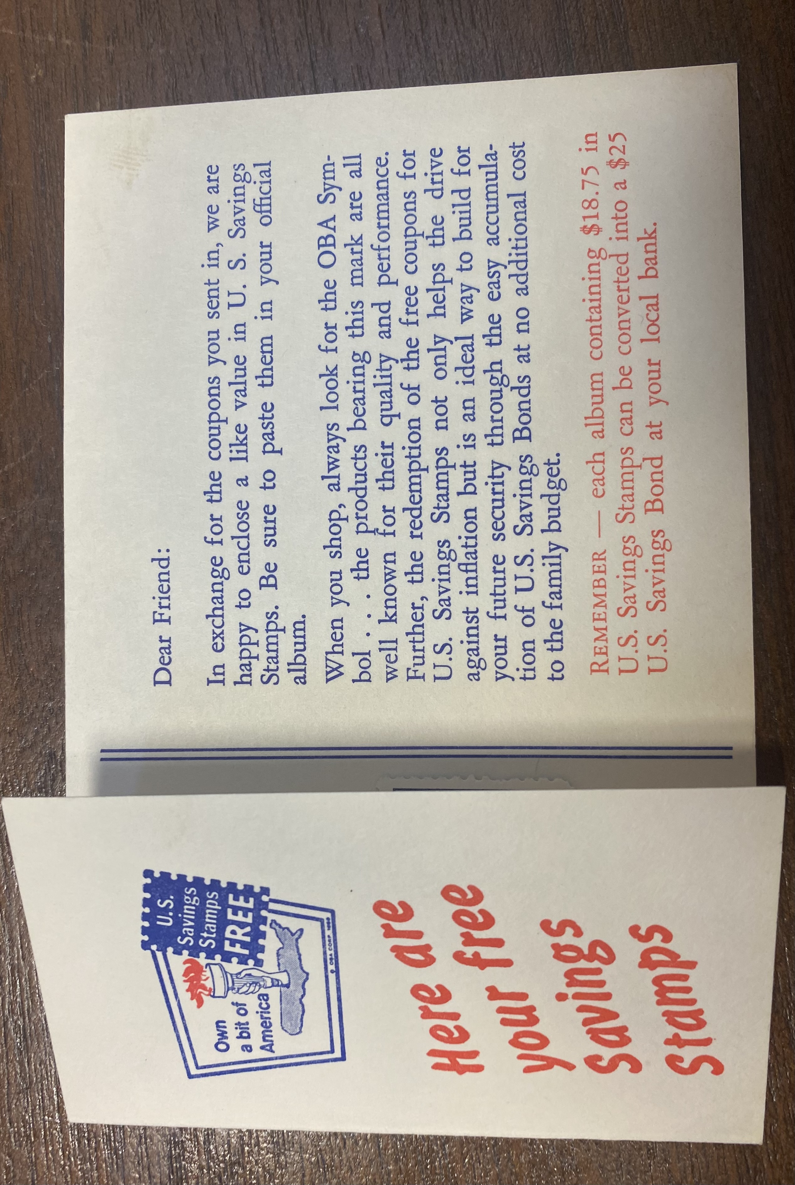 - Letter from the U.S. government thanking the recipient for sending in coupons. Inside are two 25-cent stamps