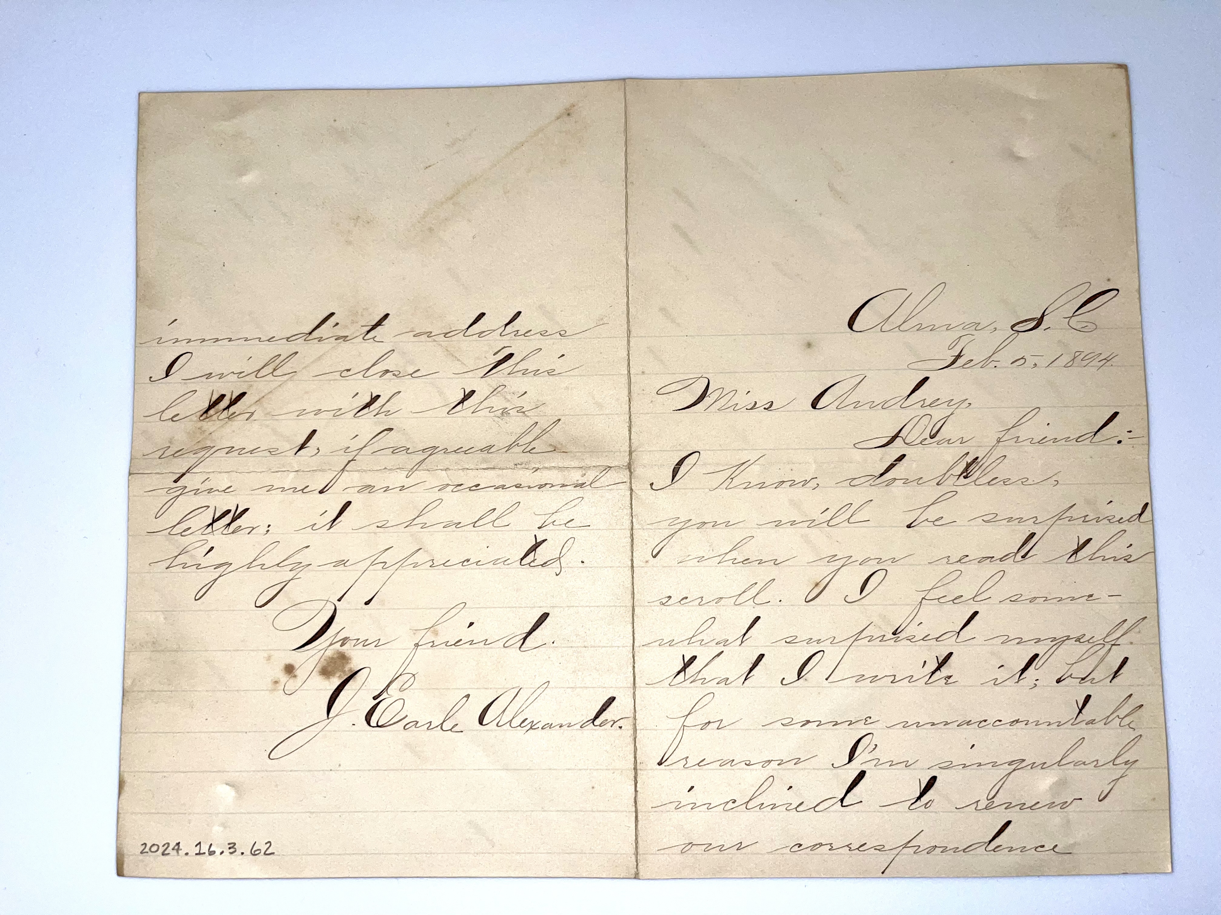Letter: Feb. 5, 1894. J. Earle Alexander to Audrey Davis