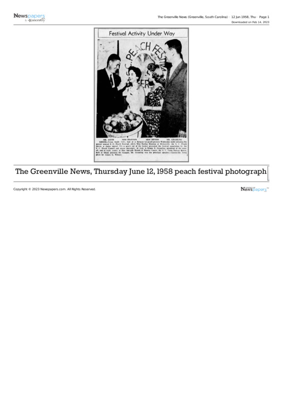 Verne Smith offers Peach Queen Martha Brannon a peach, observed by S. C. Farm Bureau Queen Adelaide Dennis and Bennie E. Gramling. This photo appears in a Greenville News article about the Peach Festival on June 12, 1958. Photographed by James G. Wilson