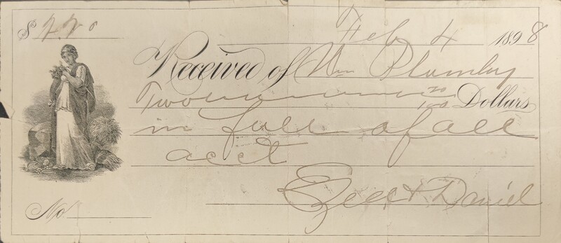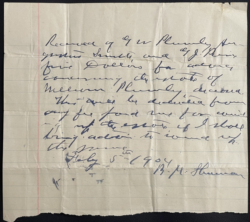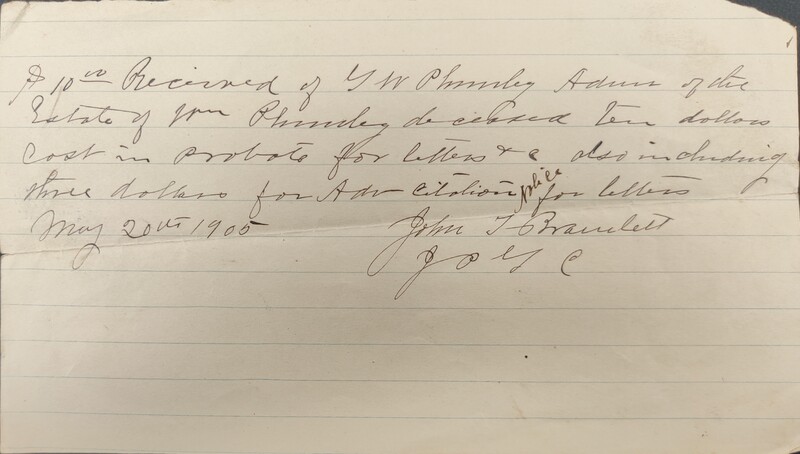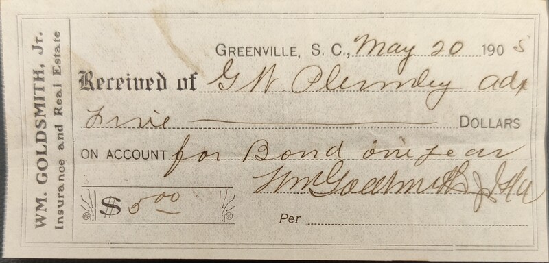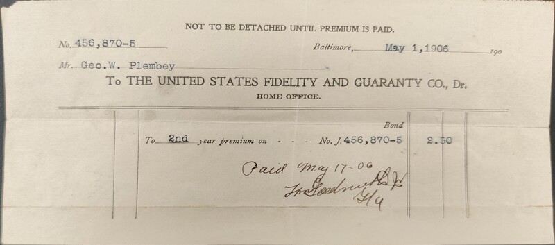 Receipt for Mr. Geo. W. Plembey, to the United States Fidelity and Guaranty Co., Dr. Home Office. To the 2nd year premium on Bond No. J. 456,870-5, $2.50. Paid May 17, 1906 signed Wm Goldsmith, Jr. G/A