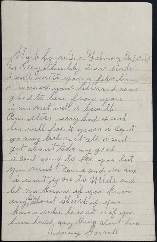 At the time of this letter, Ninevah is about 82 years old and her sister Crecy is about 63 years old. It appears that they don't write often. While Ninevah makes a bit of small talk, it is clear that she is writing to ask if Crecy knows the location or any news about "Sheerd." This is almost certainly their brother Sherod Gosnell, who went by "Sherd." He is shown in various 1800's censuses as living in Glassy Mountain; he fought in the Civil War, then is shown back at Glassy Mountain in 1880. The 1890 census does not exist, having been burned in a fire. Sherd died in Tryon, NC, in 1900.