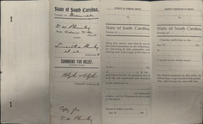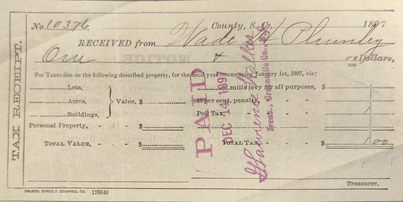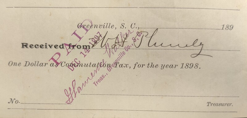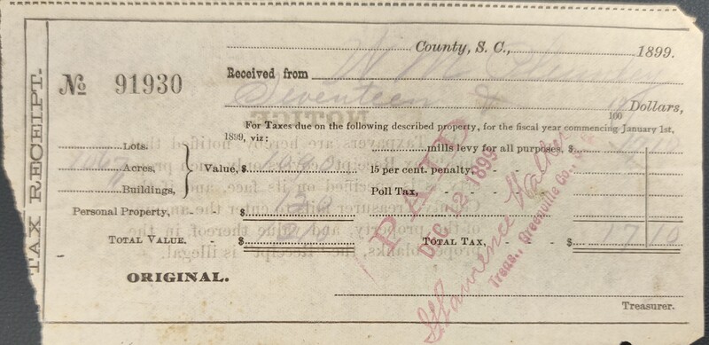 Greenville County tax receipt for W. M. Plumley for $17.10, levied on 1,067 acres valued at $1,090 with one building, and personal property of $120, for a total value of $1,210. Paid on Dec. 12, 1899.