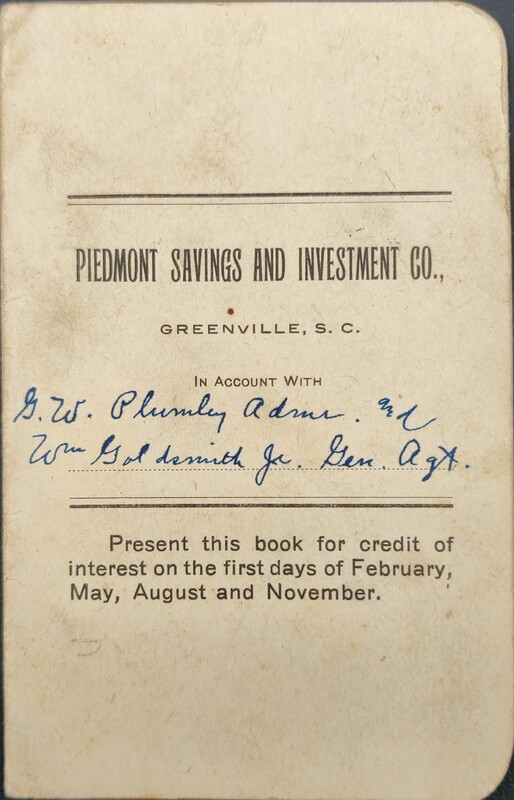 Pad checkbook from Piedmont Savings and Investment Company. While there is no direct indication this is related to the Plumleys, it was found in our collection beside item 2023.44.1, a Piedmont S&I account register from the same time period.