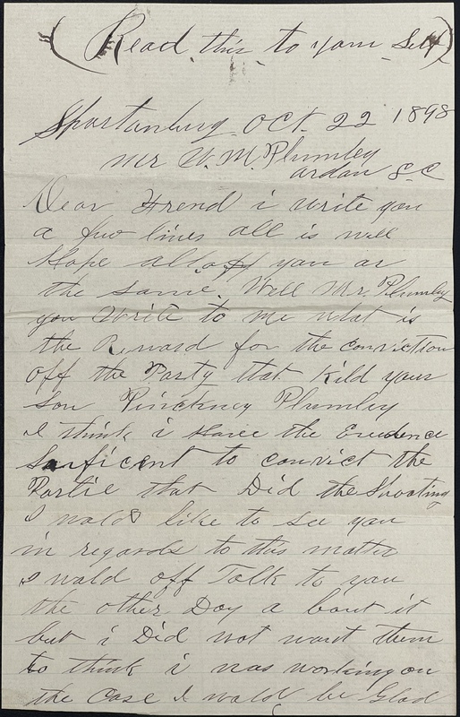This letter claims to know who shot William Plumley's son "Pink" (Pinkney), and is asking the amount of the reward for turning it in.