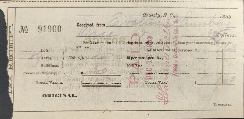 Greenville County tax receipt for Evaline Plumbley. Paid $1.63 tax levied on 80 acres with 1 building valued at $85, and personal property valued at $30, for a total value of $115. Paid on Dec. 12, 1899.