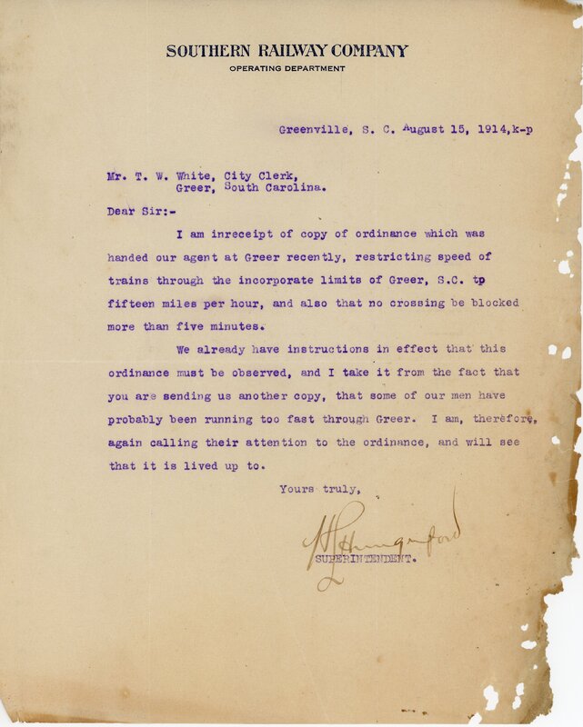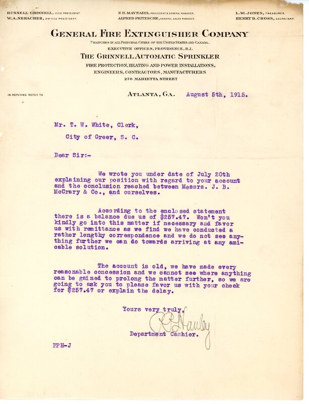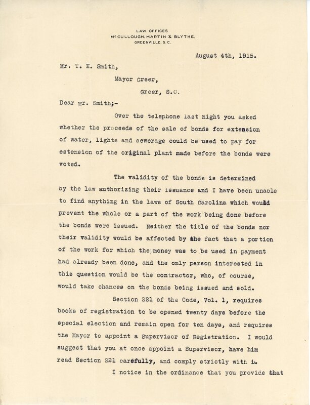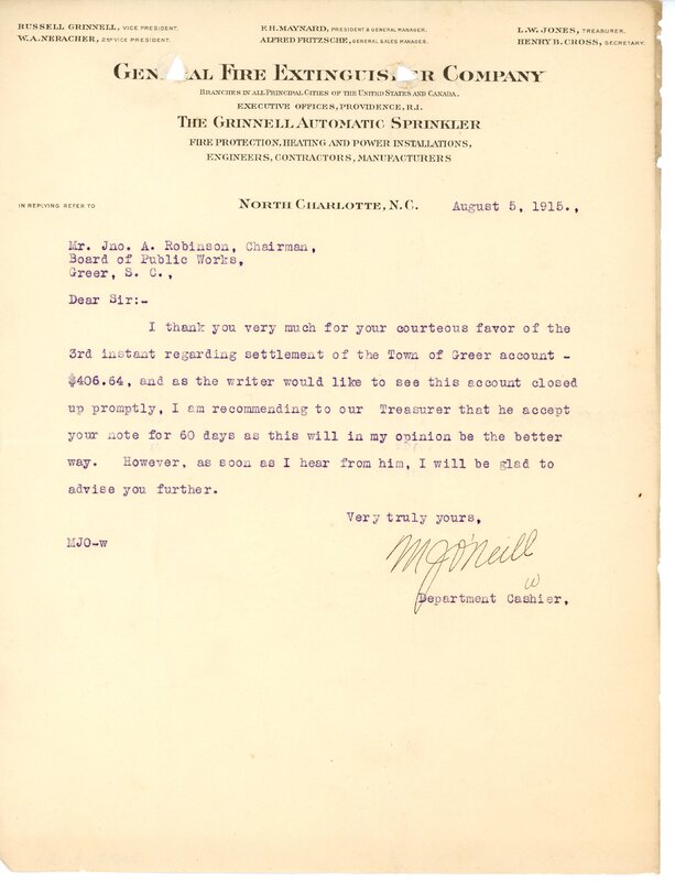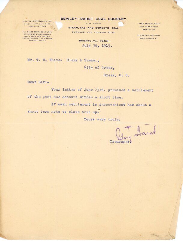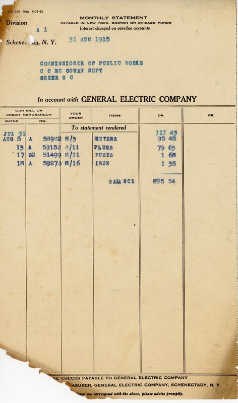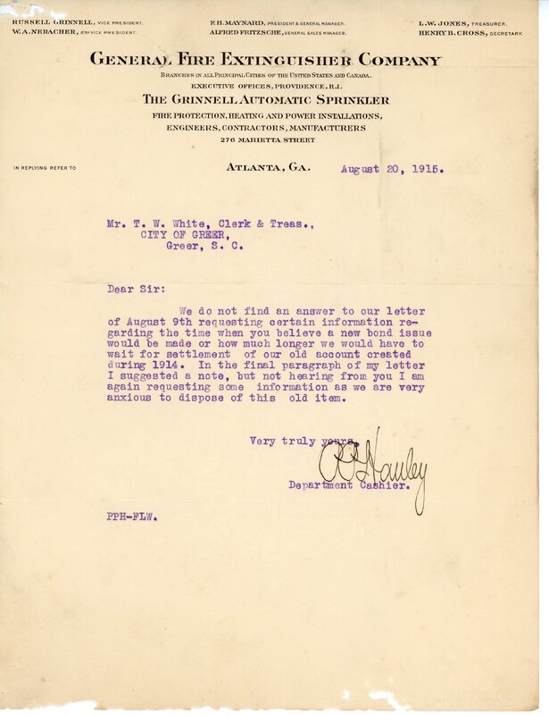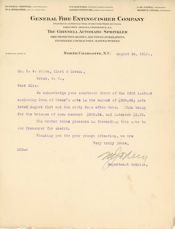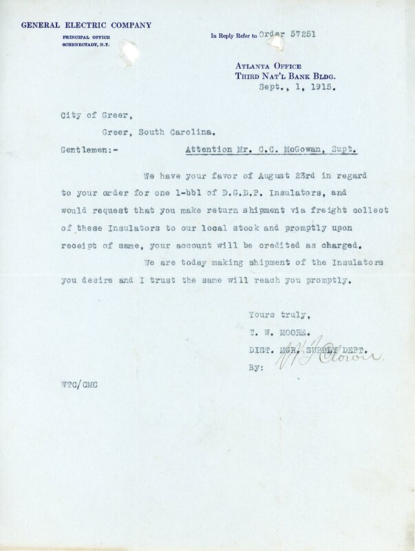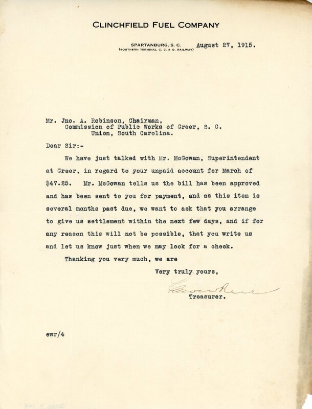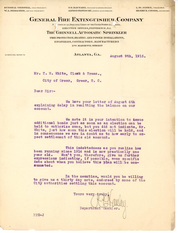 Primarily documentation of the first power plant, electric lines, electric lights, waterworks, and sewer in Greer. Other documents reference the police hunt for blind tigers, including hiring private investigators and requesting detectives from the Governor's office; correspondence with the Piedmont & Northern about the construction of a depot on the town square; documents referencing a serious business recession in 1915-16 resulting in the city of Greer unable to pay its bills; health and sanitation; and other miscellaneous city-related documents.