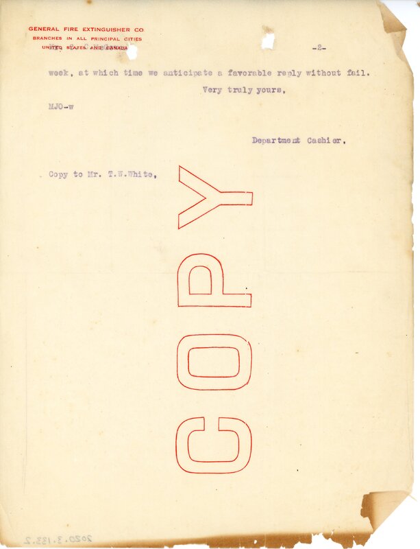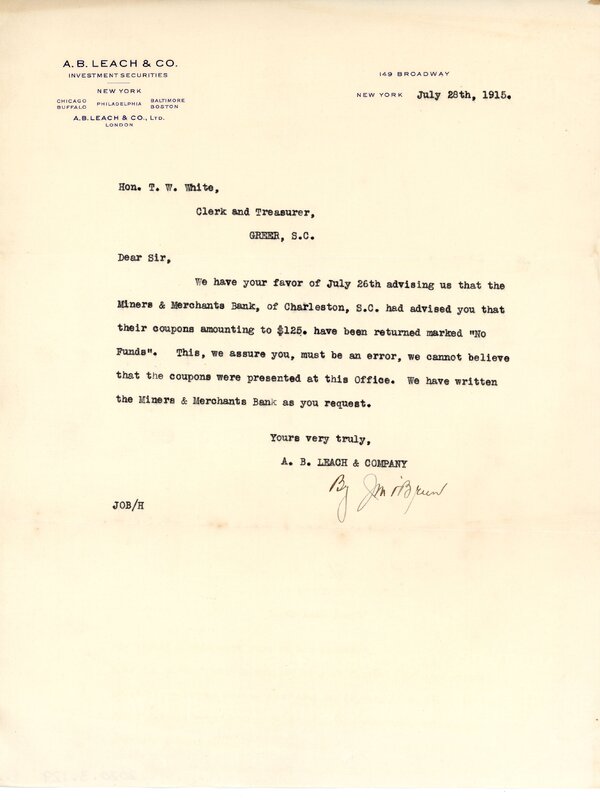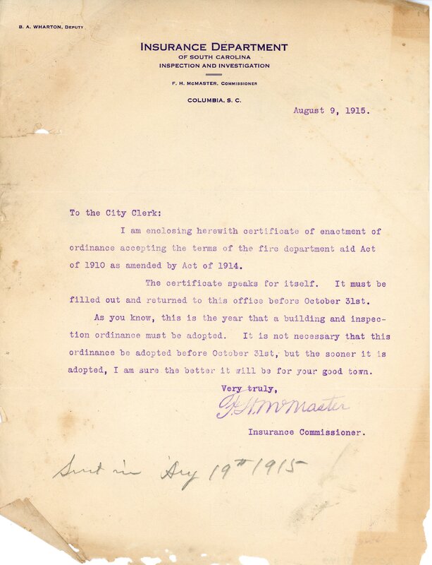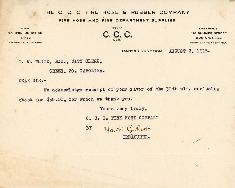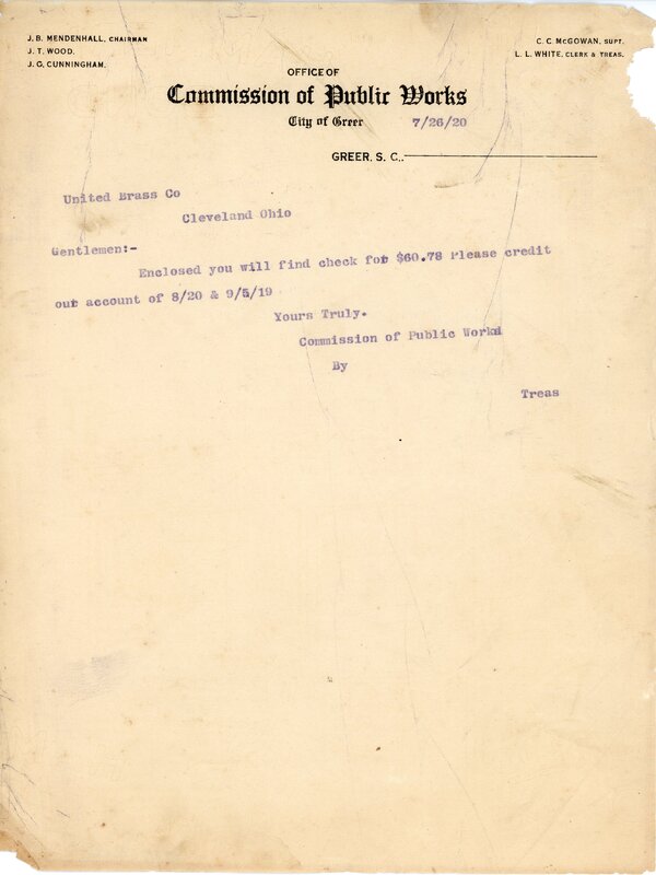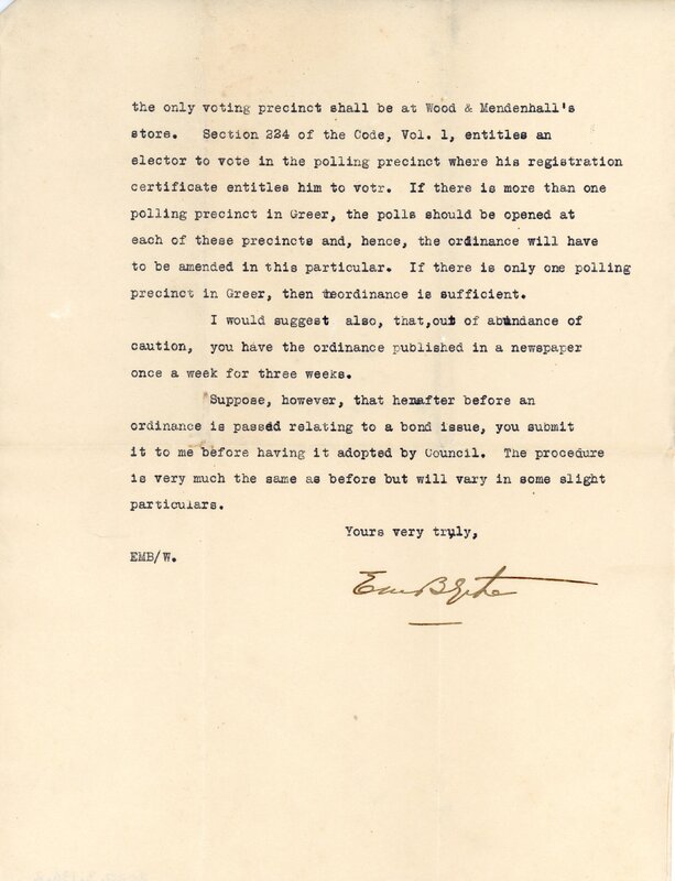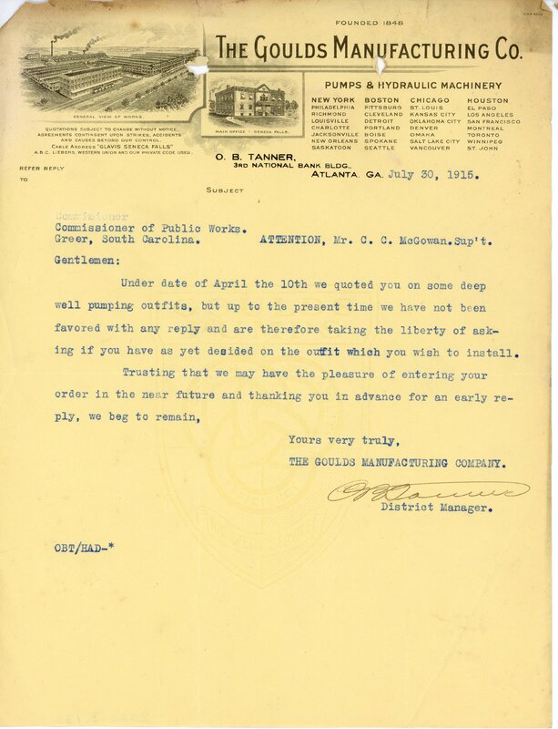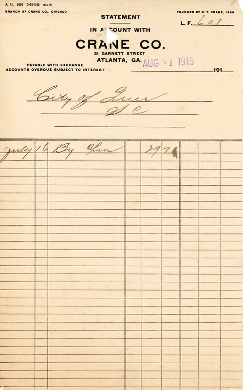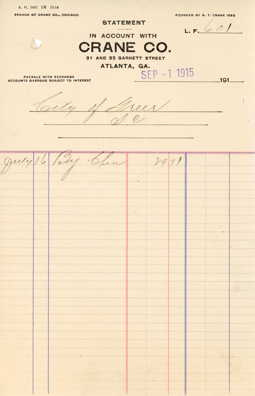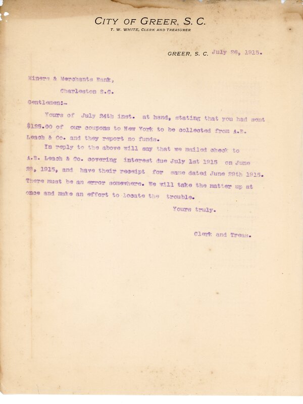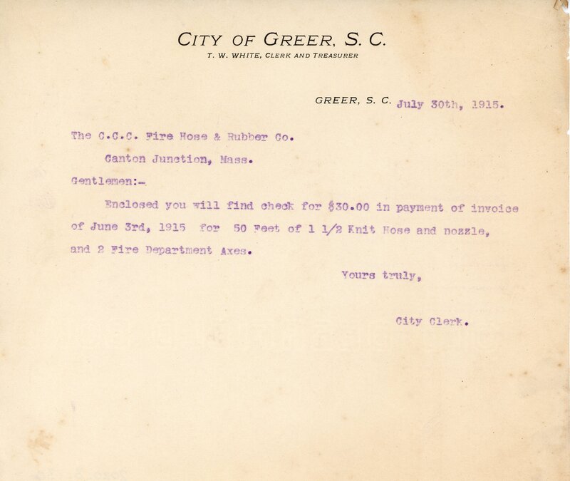 Primarily documentation of the first power plant, electric lines, electric lights, waterworks, and sewer in Greer. Other documents reference the police hunt for blind tigers, including hiring private investigators and requesting detectives from the Governor's office; correspondence with the Piedmont & Northern about the construction of a depot on the town square; documents referencing a serious business recession in 1915-16 resulting in the city of Greer unable to pay its bills; health and sanitation; and other miscellaneous city-related documents.