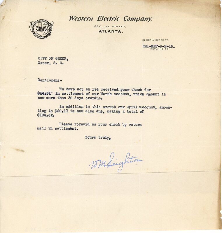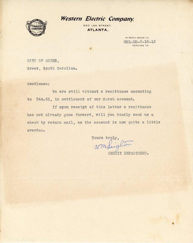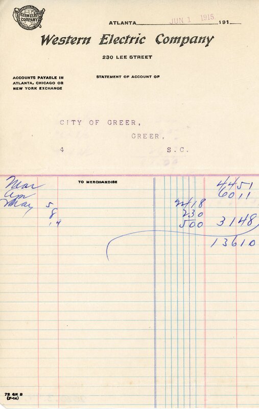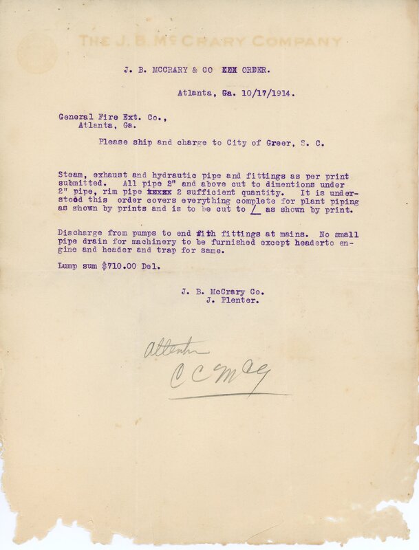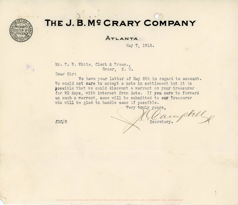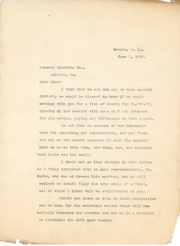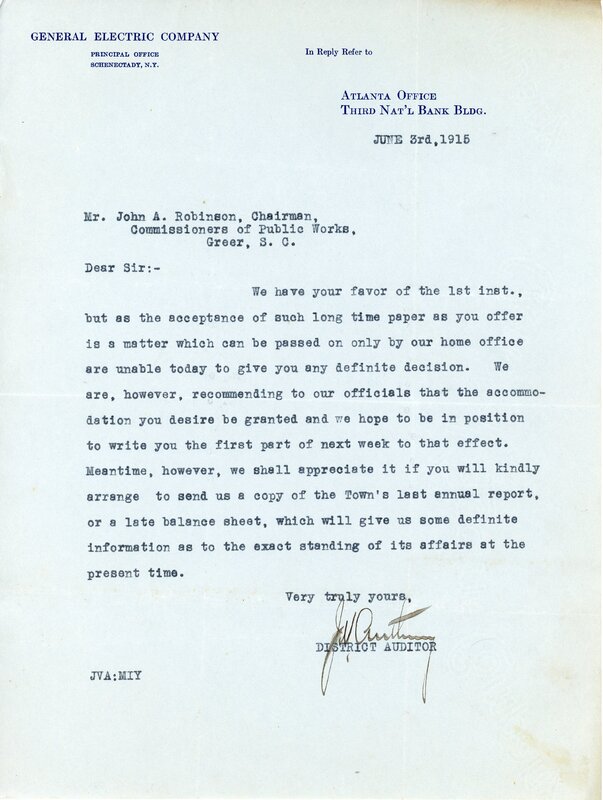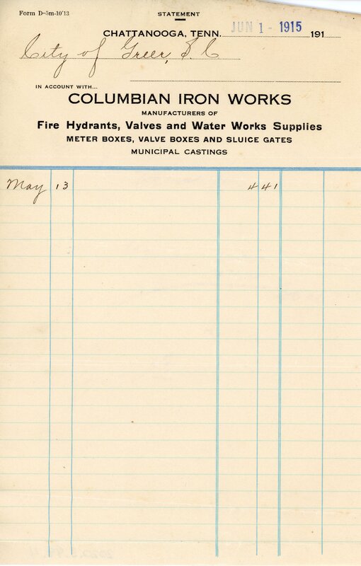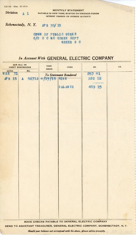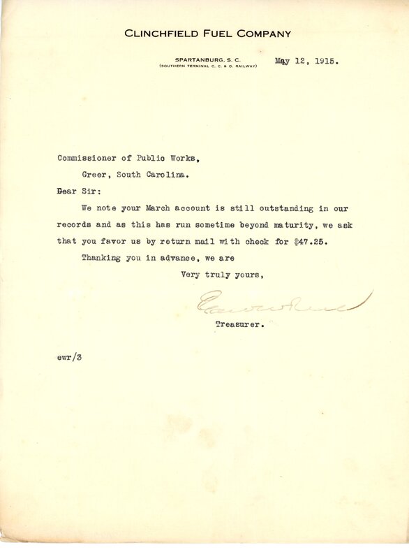 Primarily documentation of the first power plant, electric lines, electric lights, waterworks, and sewer in Greer. Other documents reference the police hunt for blind tigers, including hiring private investigators and requesting detectives from the Governor's office; correspondence with the Piedmont & Northern about the construction of a depot on the town square; documents referencing a serious business recession in 1915-16 resulting in the city of Greer unable to pay its bills; health and sanitation; and other miscellaneous city-related documents.