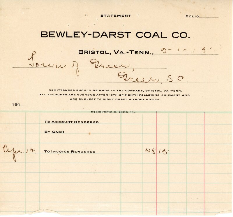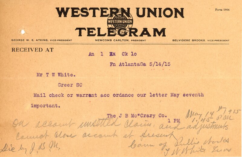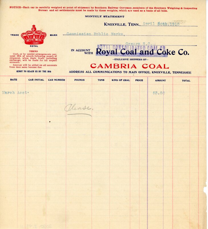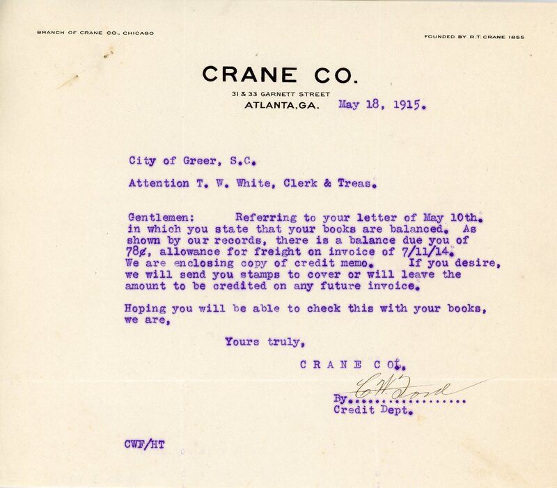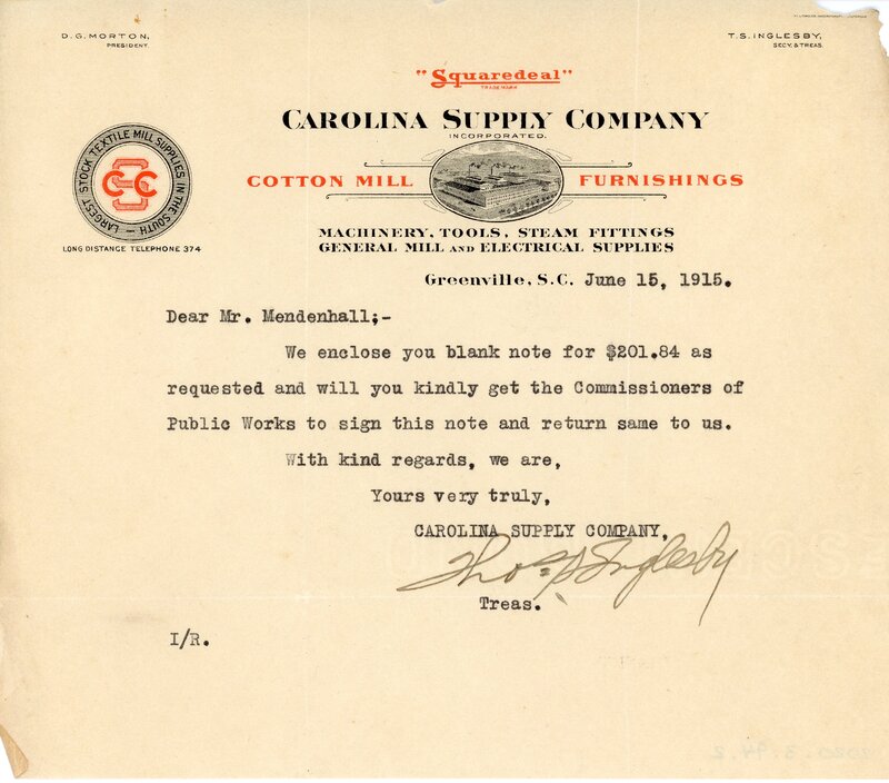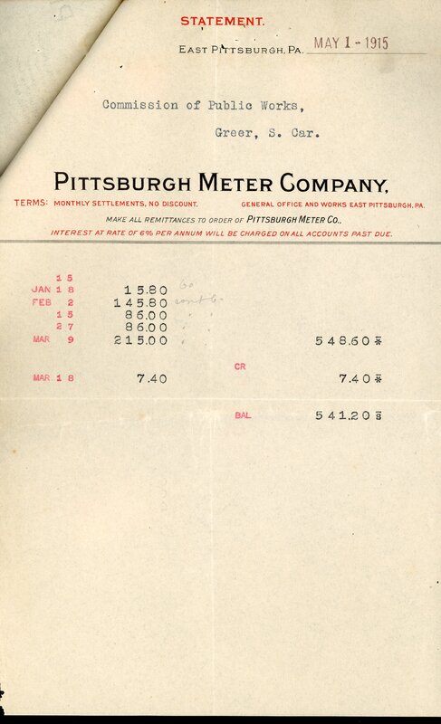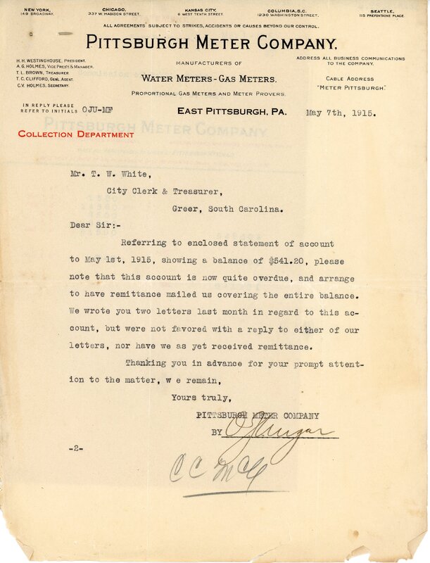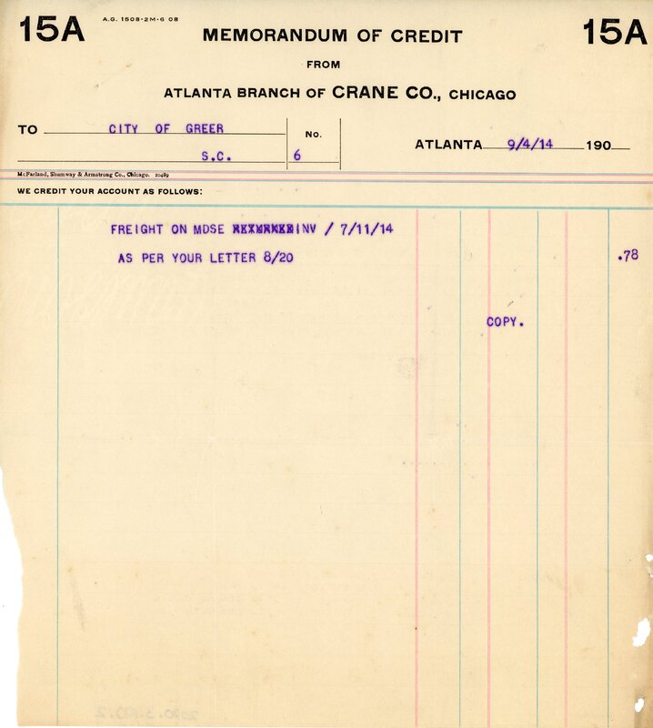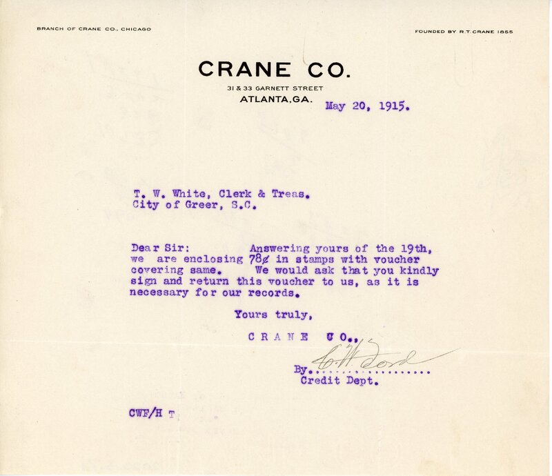 Primarily documentation of the first power plant, electric lines, electric lights, waterworks, and sewer in Greer. Other documents reference the police hunt for blind tigers, including hiring private investigators and requesting detectives from the Governor's office; correspondence with the Piedmont & Northern about the construction of a depot on the town square; documents referencing a serious business recession in 1915-16 resulting in the city of Greer unable to pay its bills; health and sanitation; and other miscellaneous city-related documents.