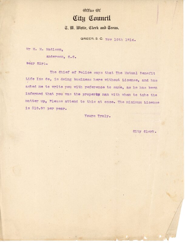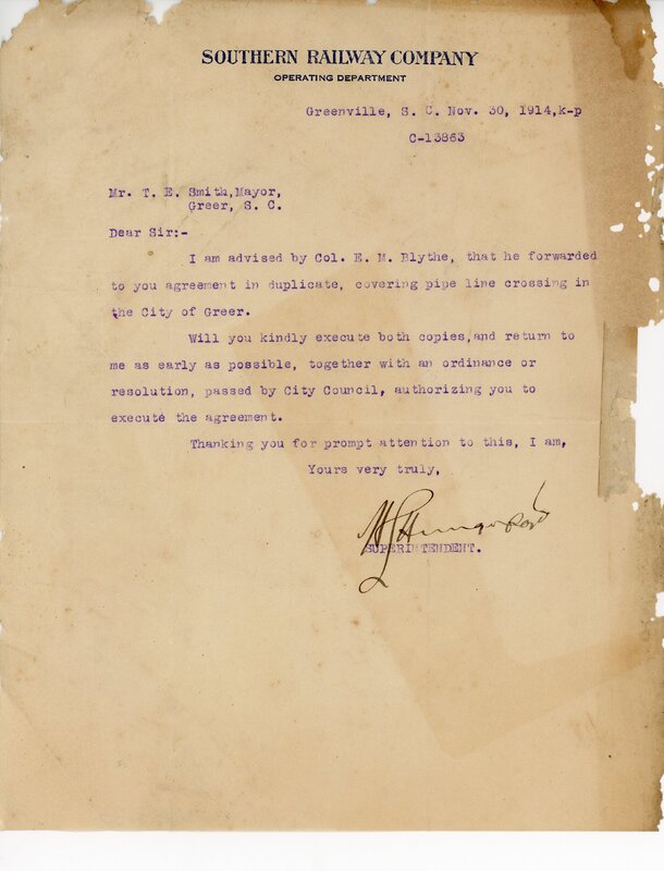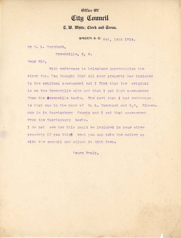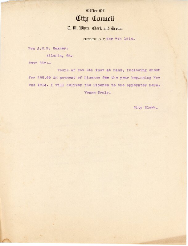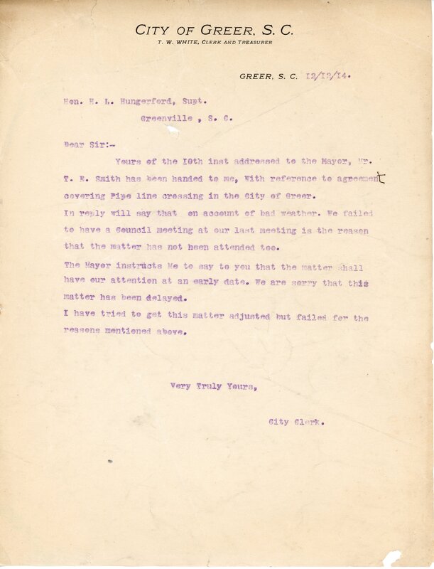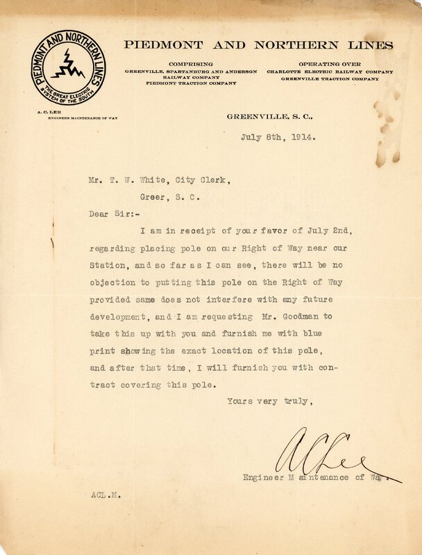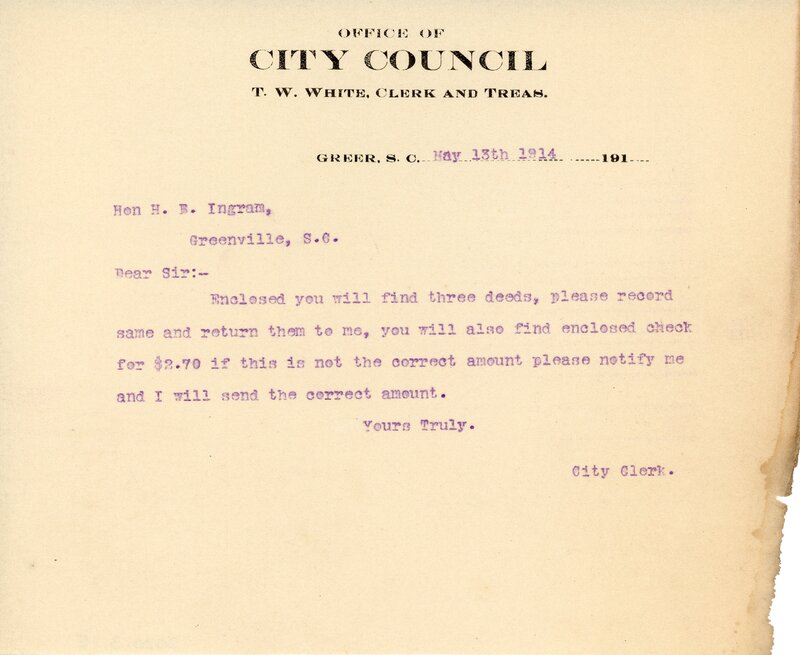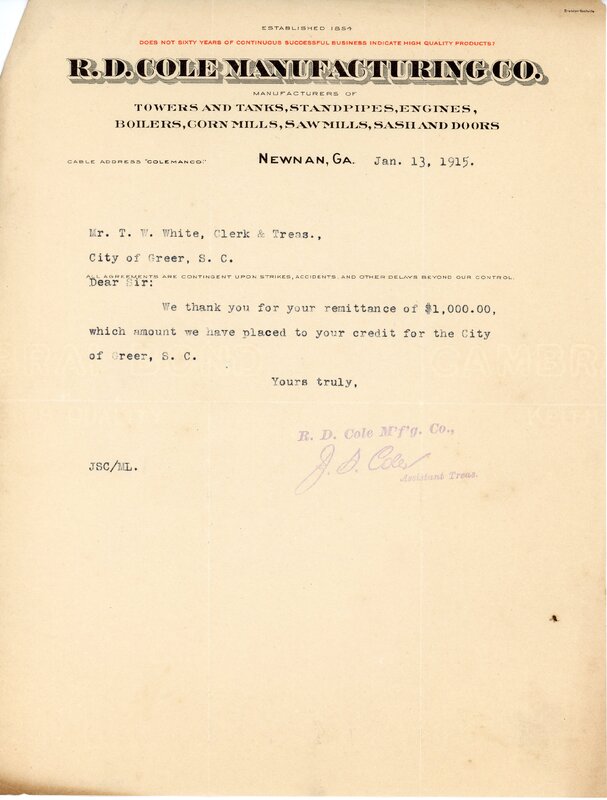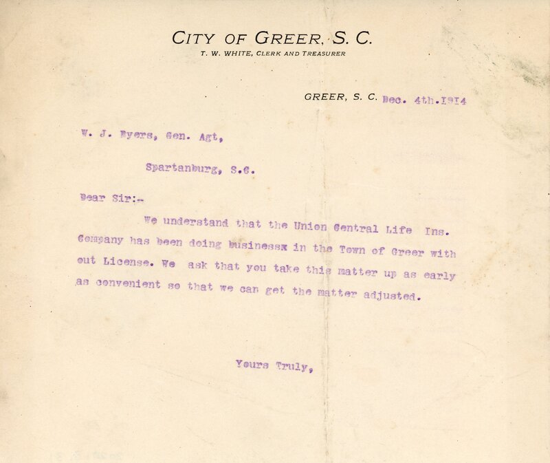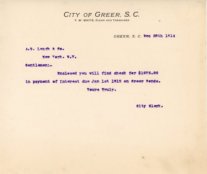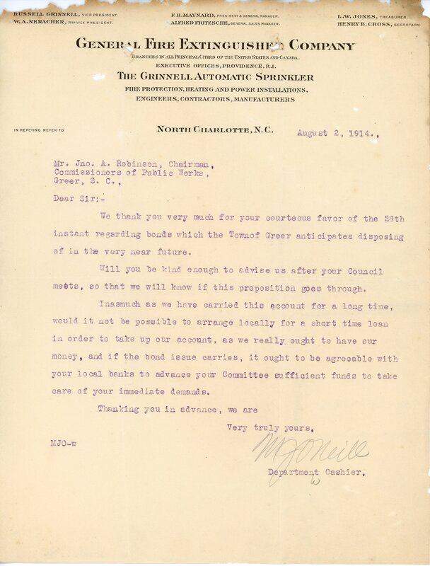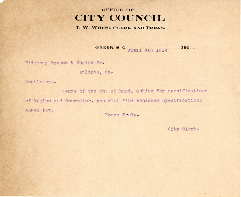 Primarily documentation of the first power plant, electric lines, electric lights, waterworks, and sewer in Greer. Other documents reference the police hunt for blind tigers, including hiring private investigators and requesting detectives from the Governor's office; correspondence with the Piedmont & Northern about the construction of a depot on the town square; documents referencing a serious business recession in 1915-16 resulting in the city of Greer unable to pay its bills; health and sanitation; and other miscellaneous city-related documents.