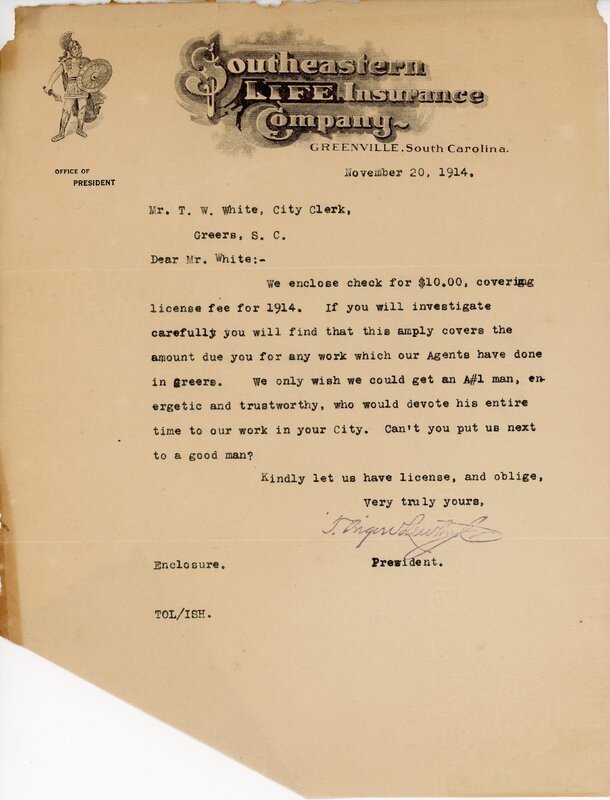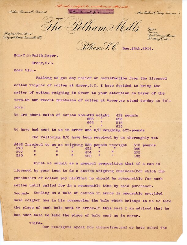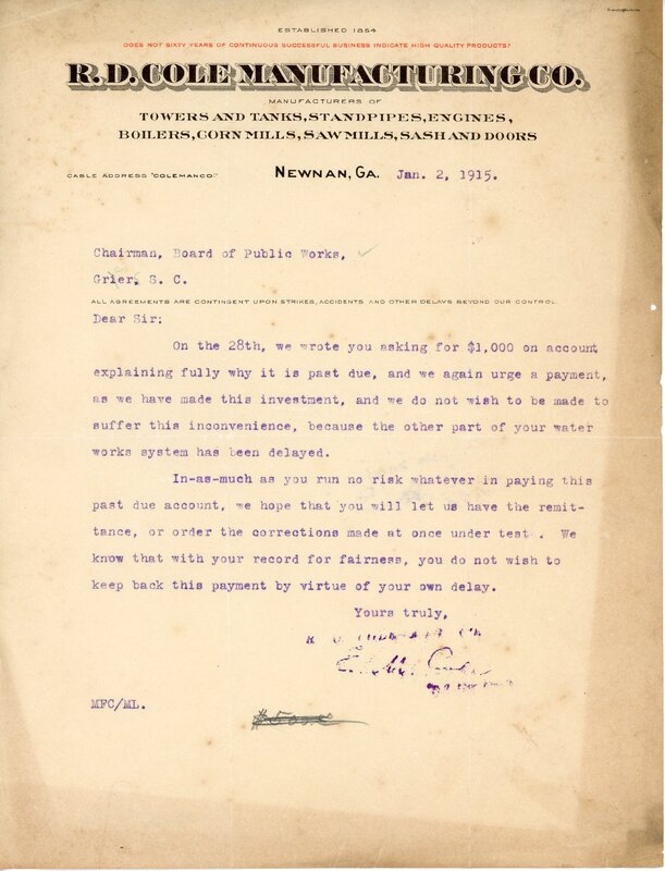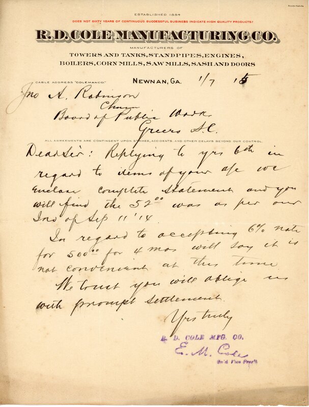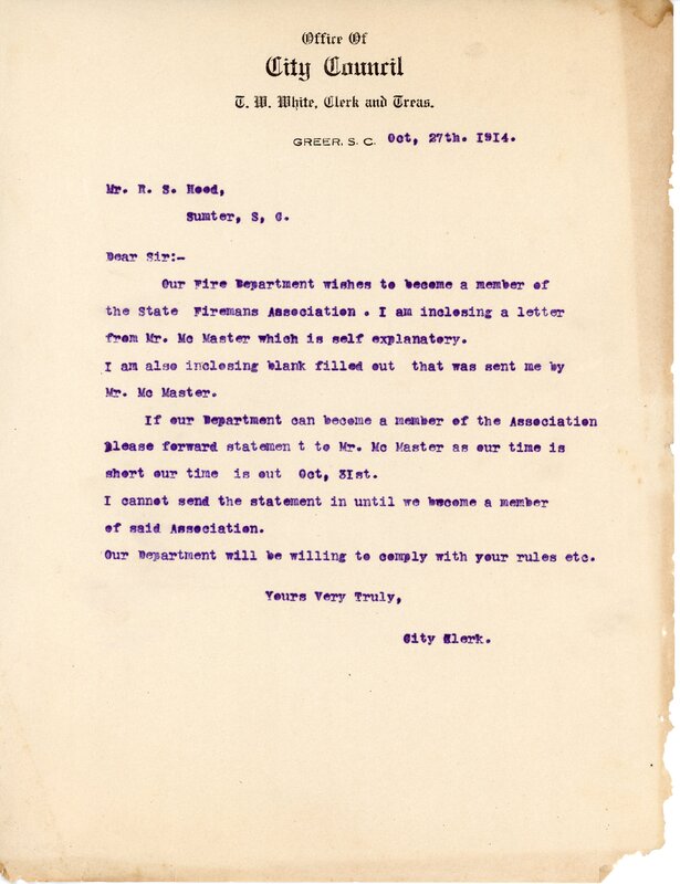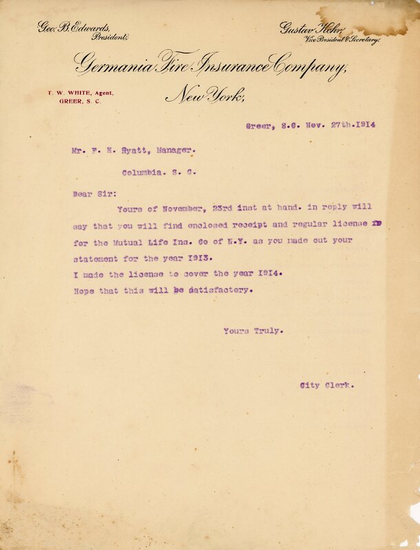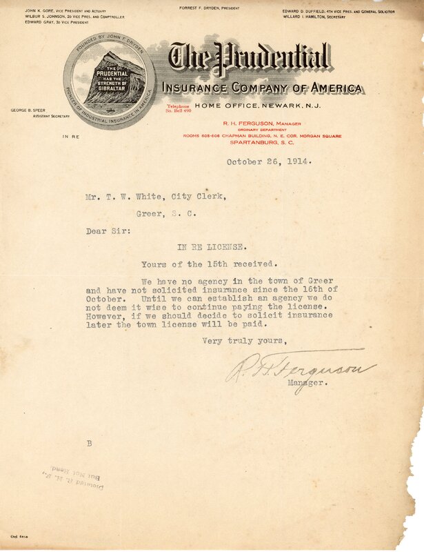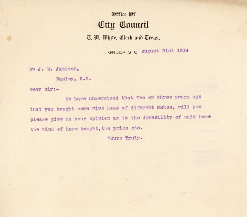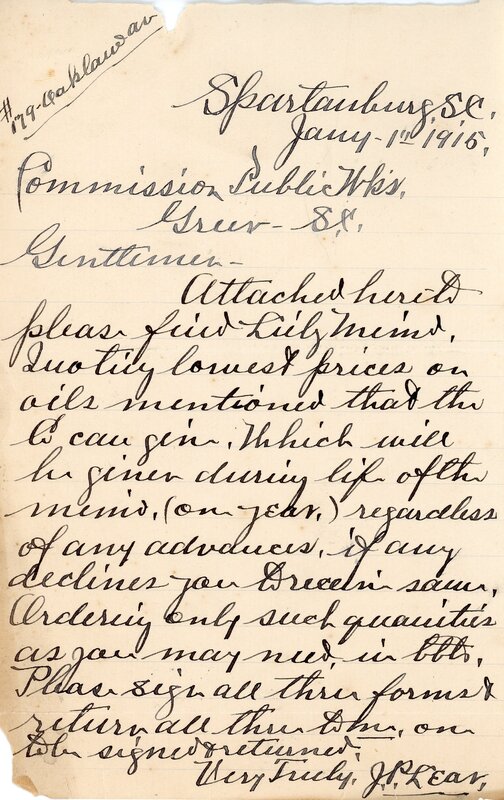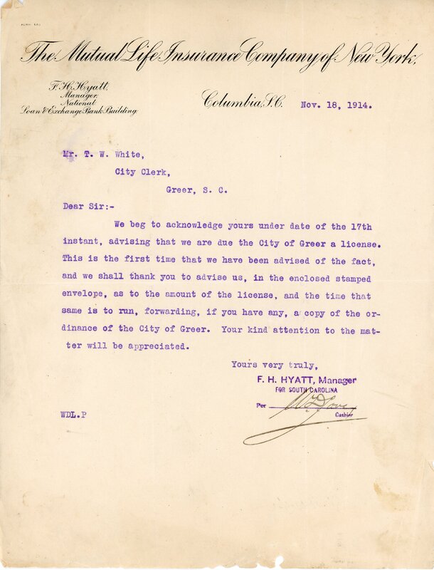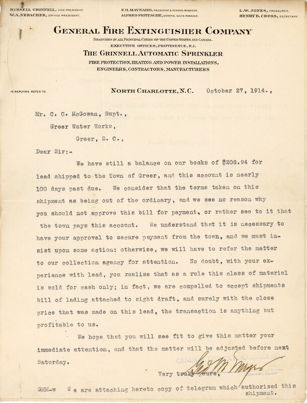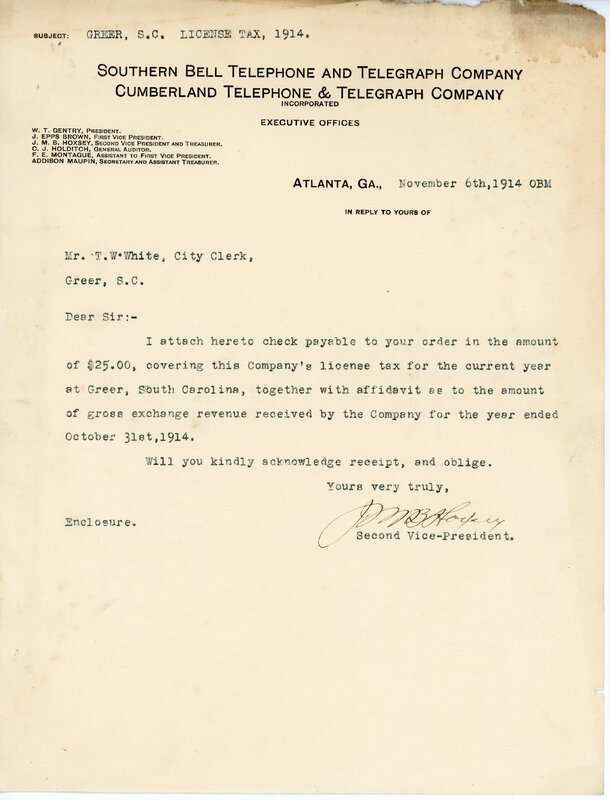 Primarily documentation of the first power plant, electric lines, electric lights, waterworks, and sewer in Greer. Other documents reference the police hunt for blind tigers, including hiring private investigators and requesting detectives from the Governor's office; correspondence with the Piedmont & Northern about the construction of a depot on the town square; documents referencing a serious business recession in 1915-16 resulting in the city of Greer unable to pay its bills; health and sanitation; and other miscellaneous city-related documents.