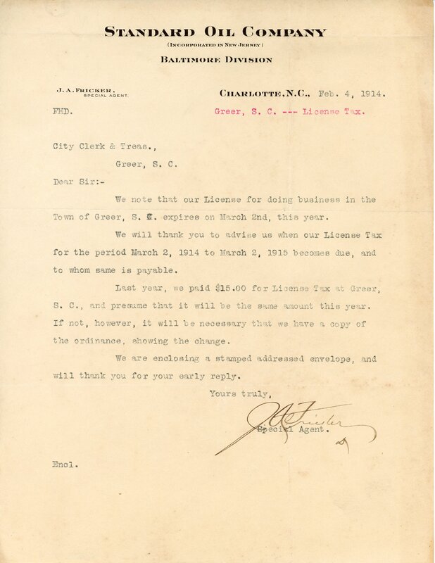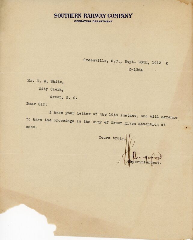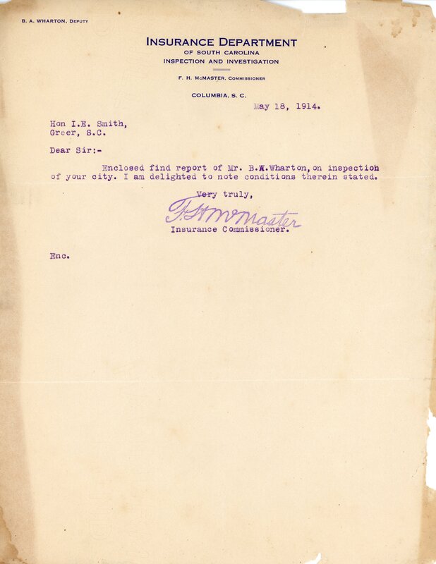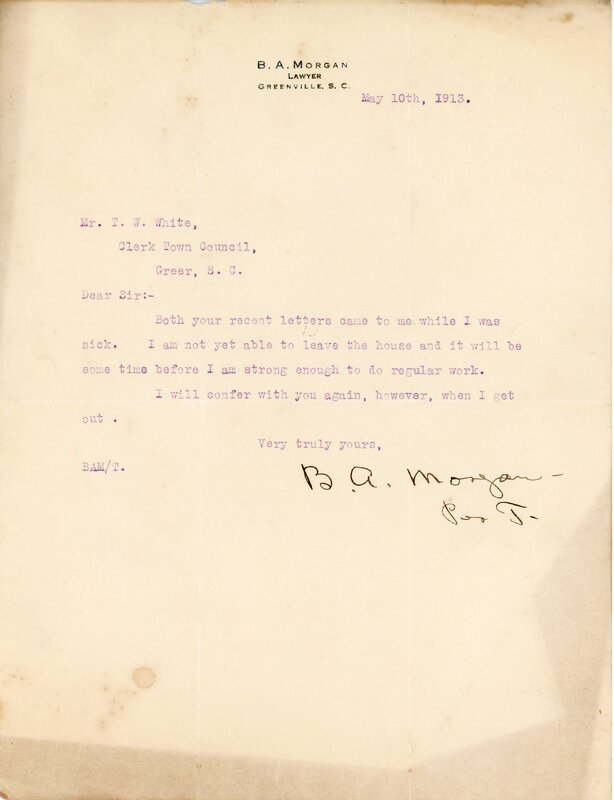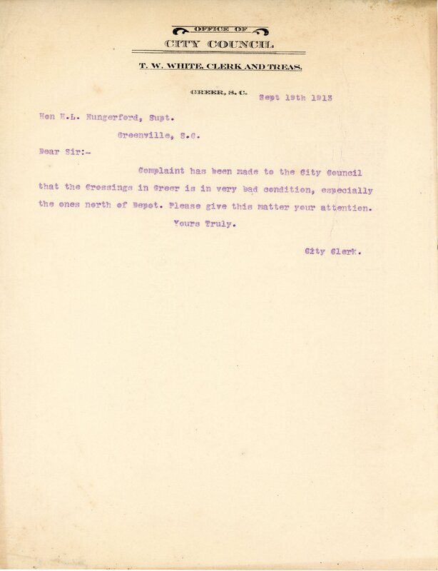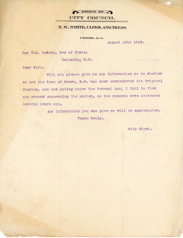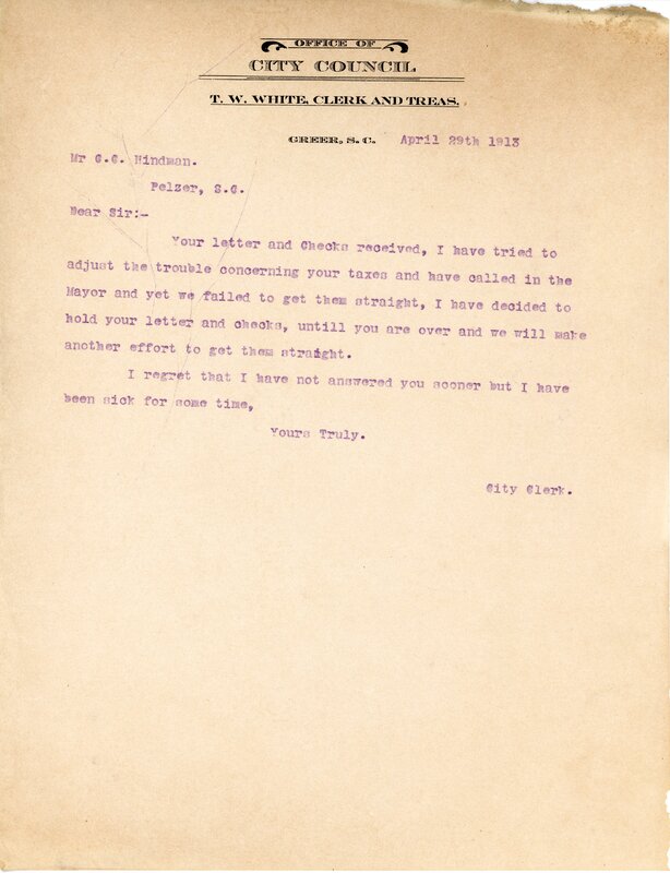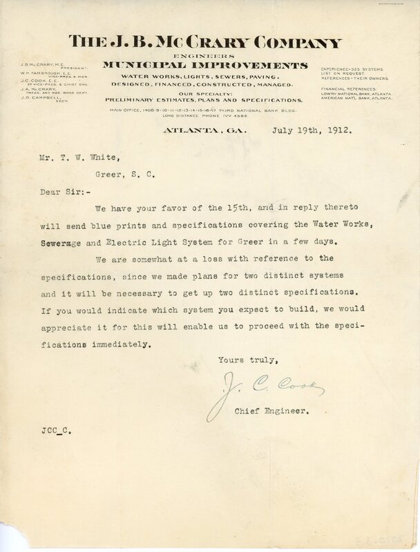 Primarily documentation of the first power plant, electric lines, electric lights, waterworks, and sewer in Greer. Other documents reference the police hunt for blind tigers, including hiring private investigators and requesting detectives from the Governor's office; correspondence with the Piedmont & Northern about the construction of a depot on the town square; documents referencing a serious business recession in 1915-16 resulting in the city of Greer unable to pay its bills; health and sanitation; and other miscellaneous city-related documents.