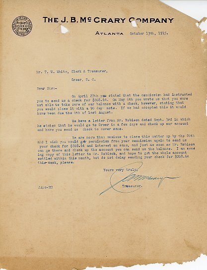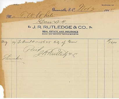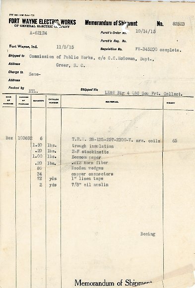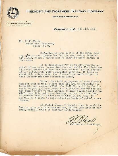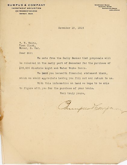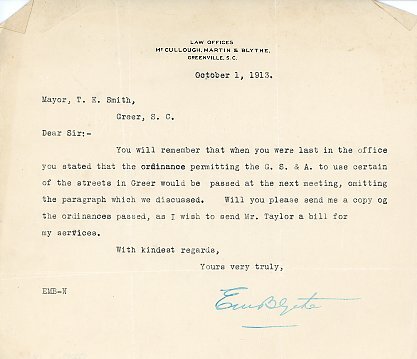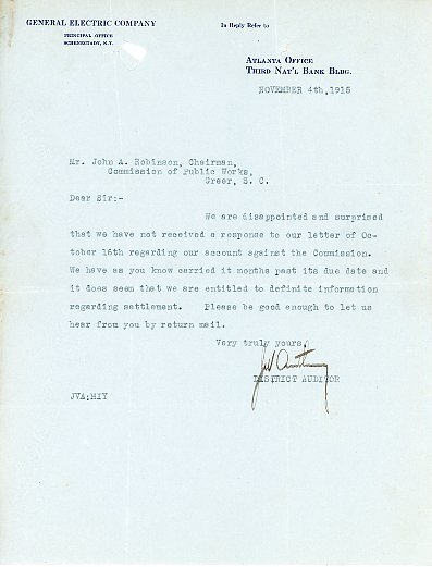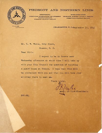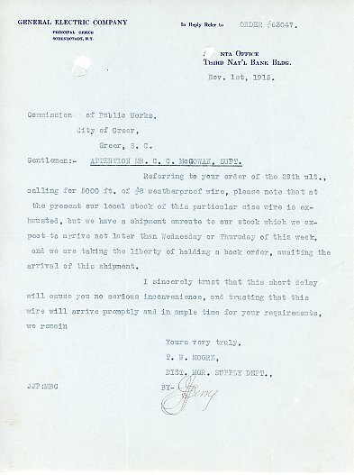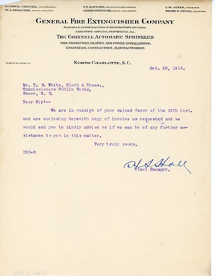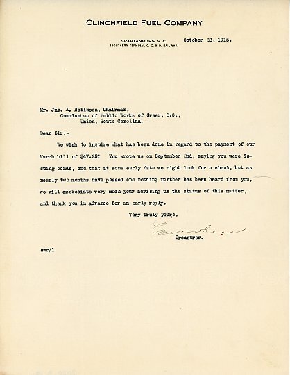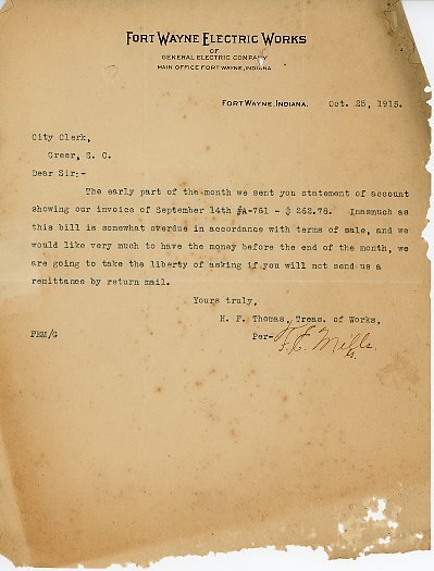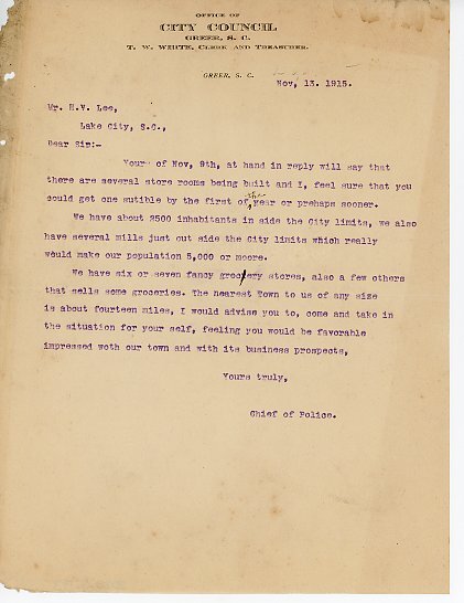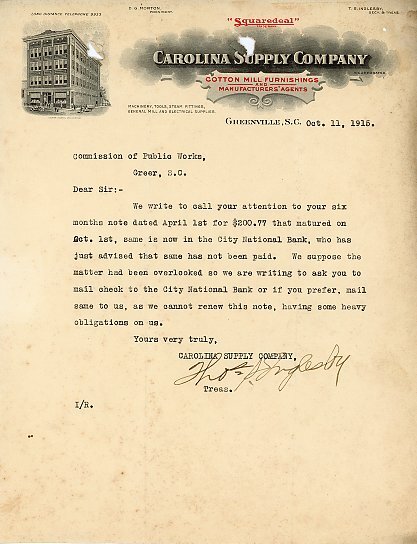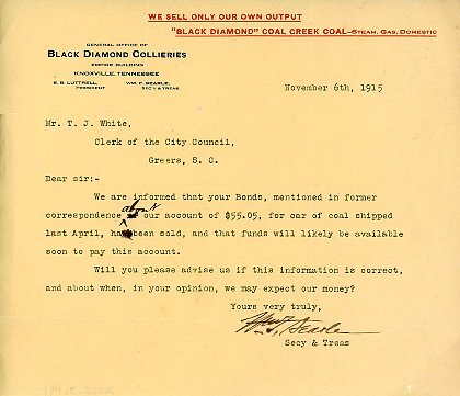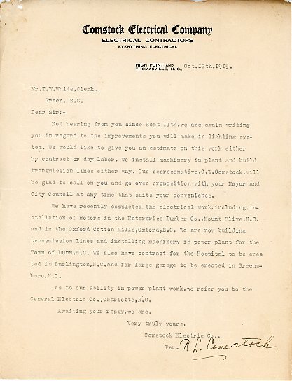 Primarily documentation of the first power plant, electric lines, electric lights, waterworks, and sewer in Greer. Other documents reference the police hunt for blind tigers, including hiring private investigators and requesting detectives from the Governor's office; correspondence with the Piedmont & Northern about the construction of a depot on the town square; documents referencing a serious business recession in 1915-16 resulting in the city of Greer unable to pay its bills; health and sanitation; and other miscellaneous city-related documents.