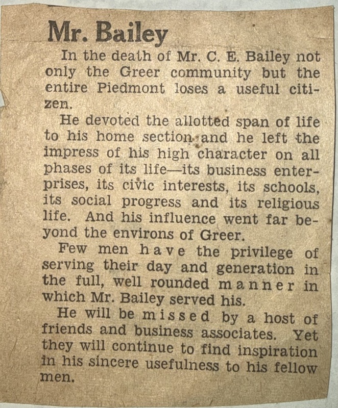 Titled: "In Memoriam," "The Late Mr. WM. C. Bailey," "Death of Mr. W.C. Bailey, of Greer's." and two untitled, identical articles, one the original copy and the other is a photocopy.