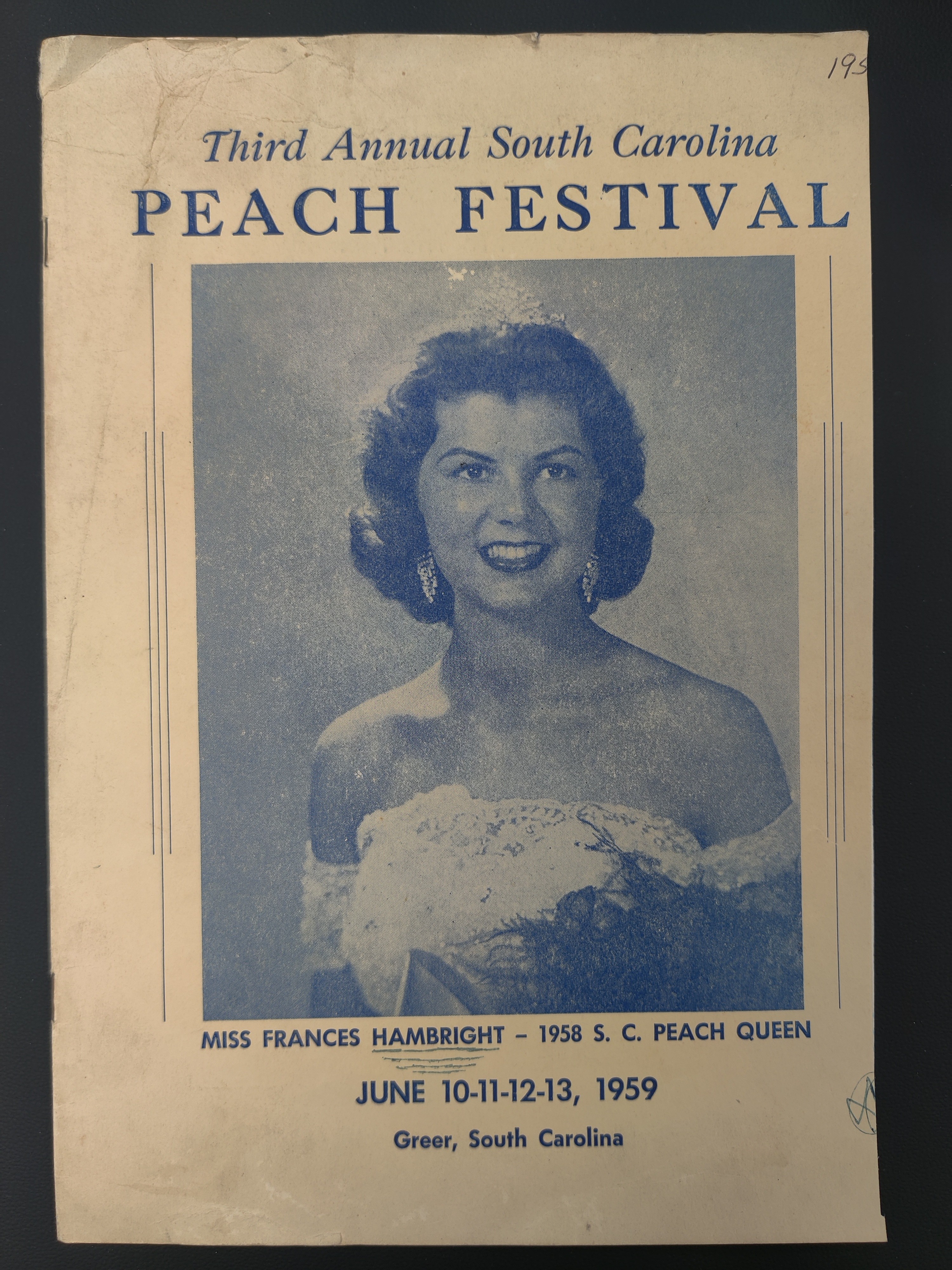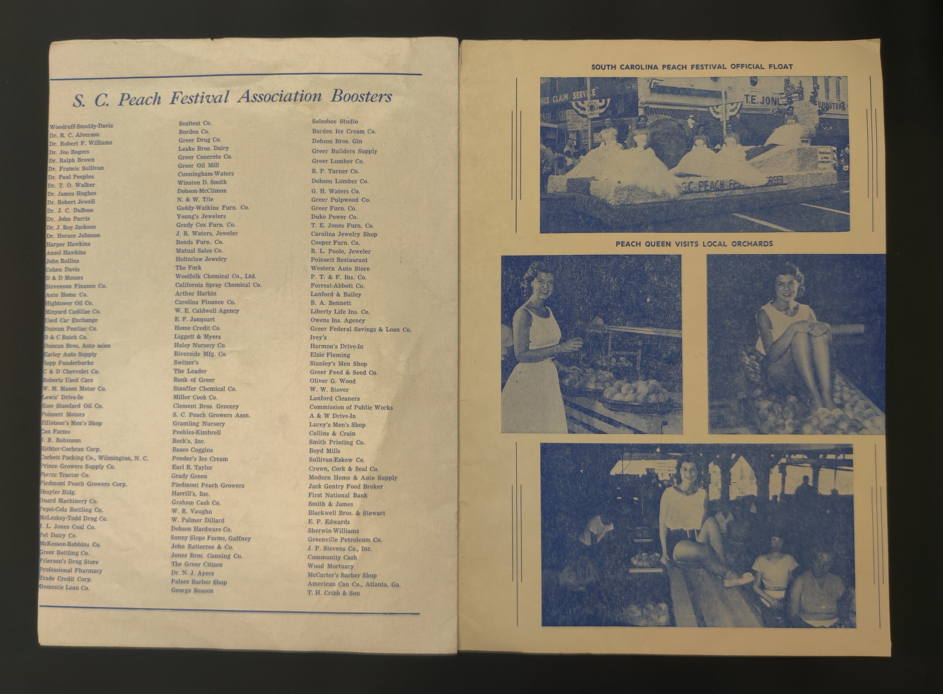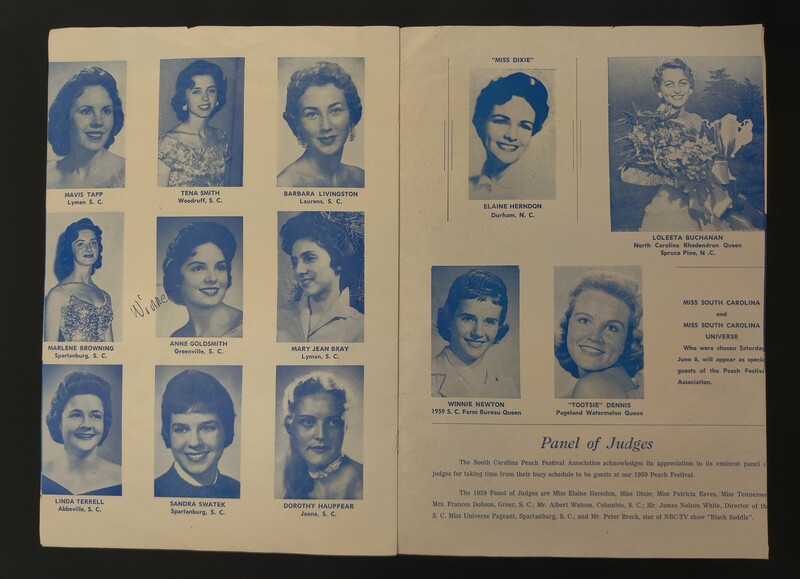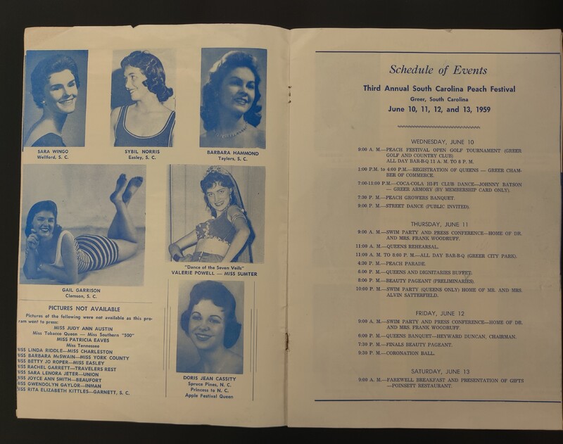 - Program for the 1959 Peach Festival including photographs of Peach Queens contestants, lists of committees and boosters, and a festival itinerary
