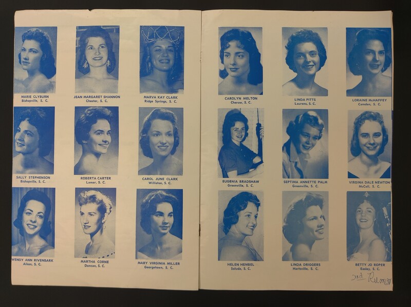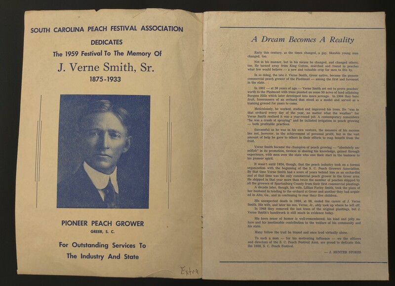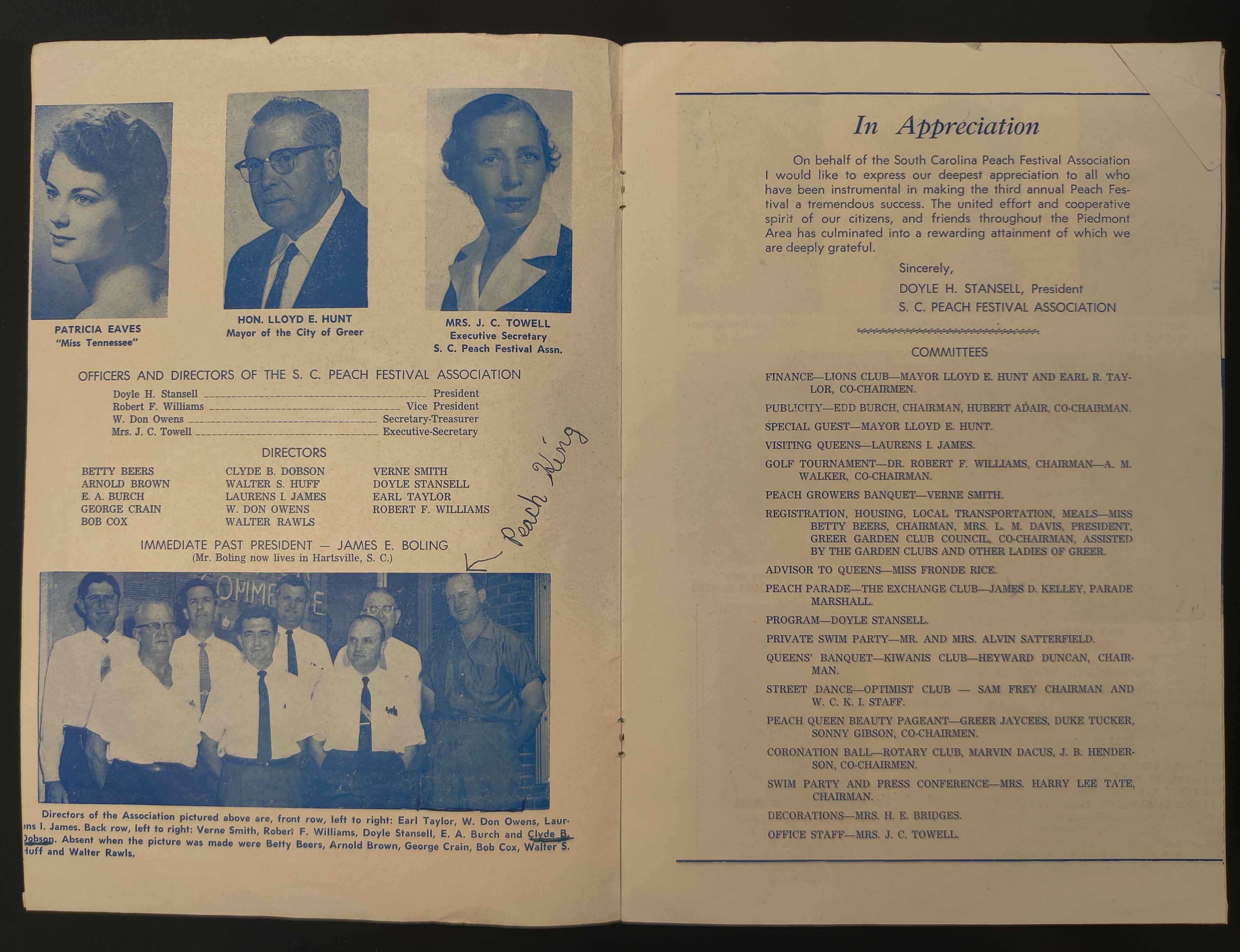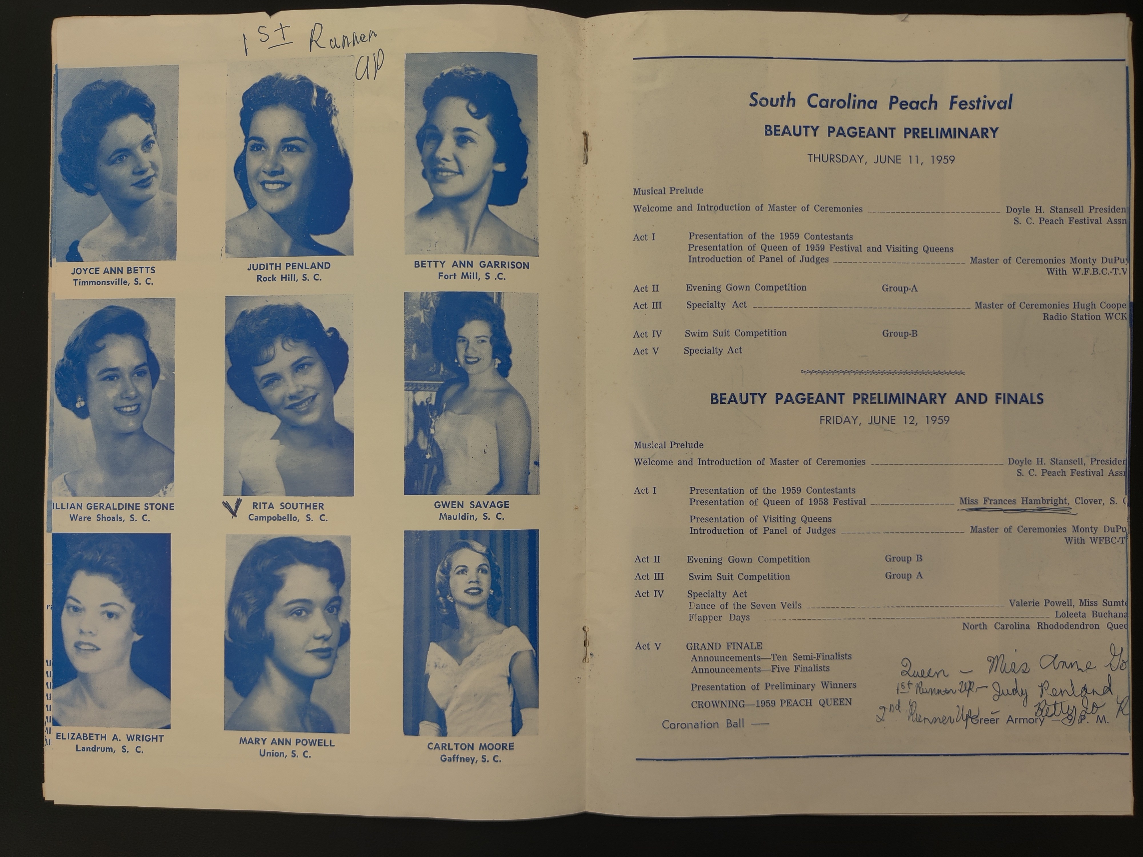- Program for the 1959 Peach Festival including photographs of Peach Queens contestants, lists of committees and boosters, and a festival itinerary