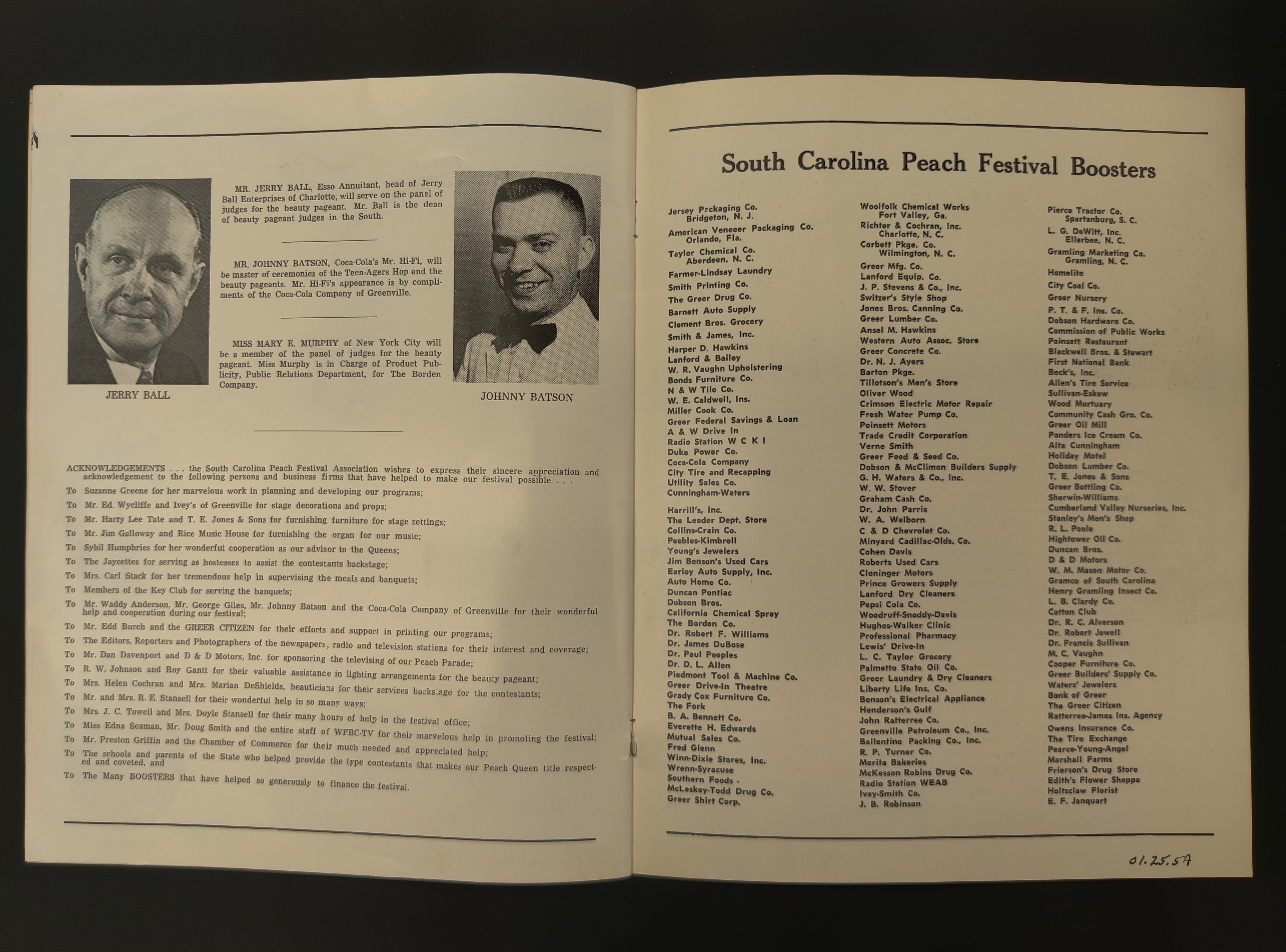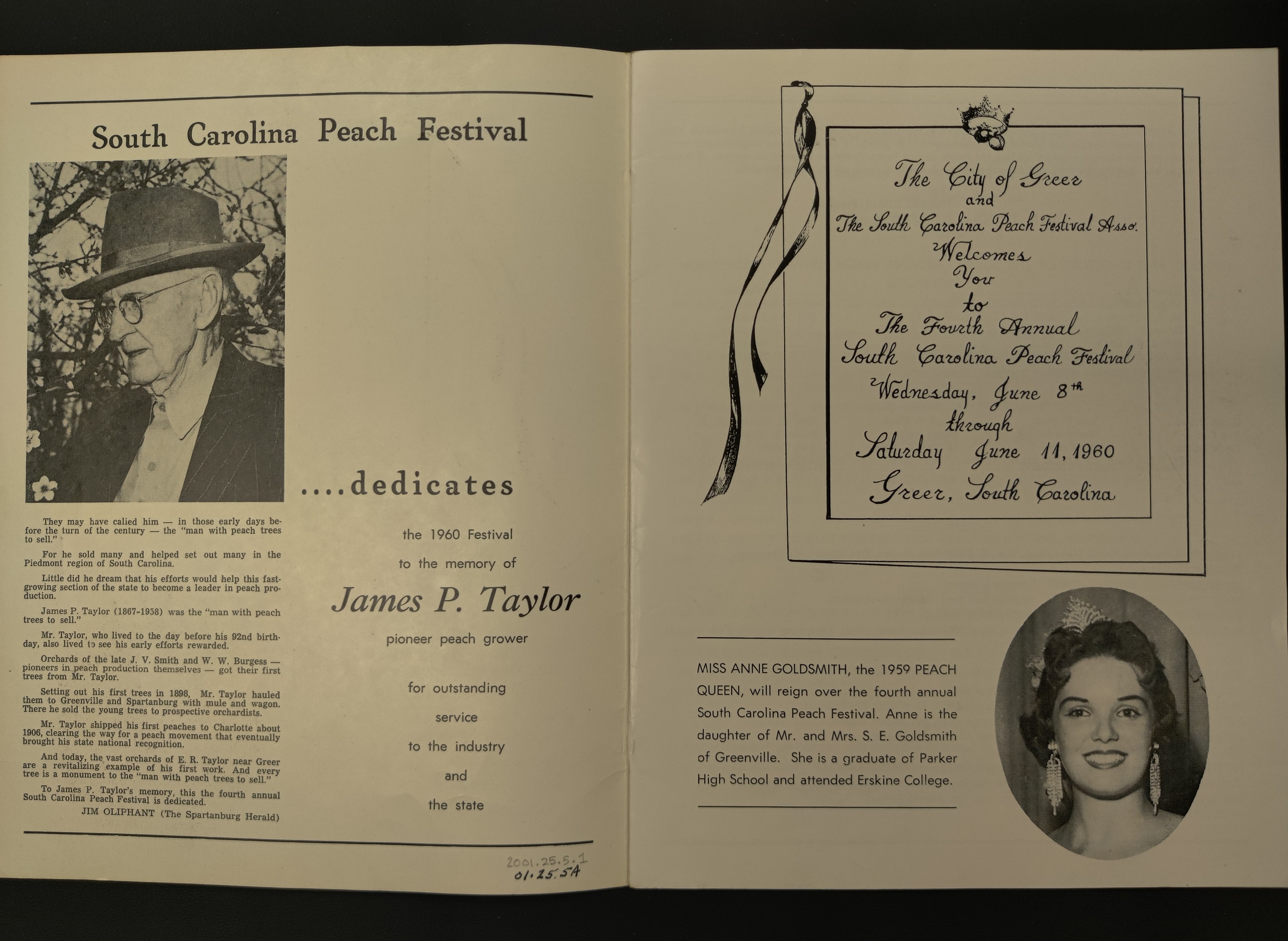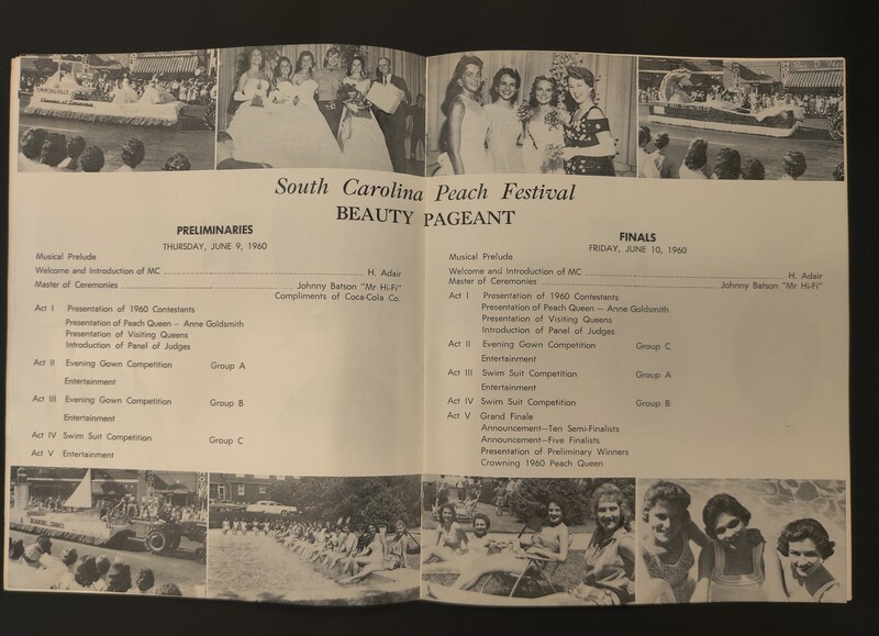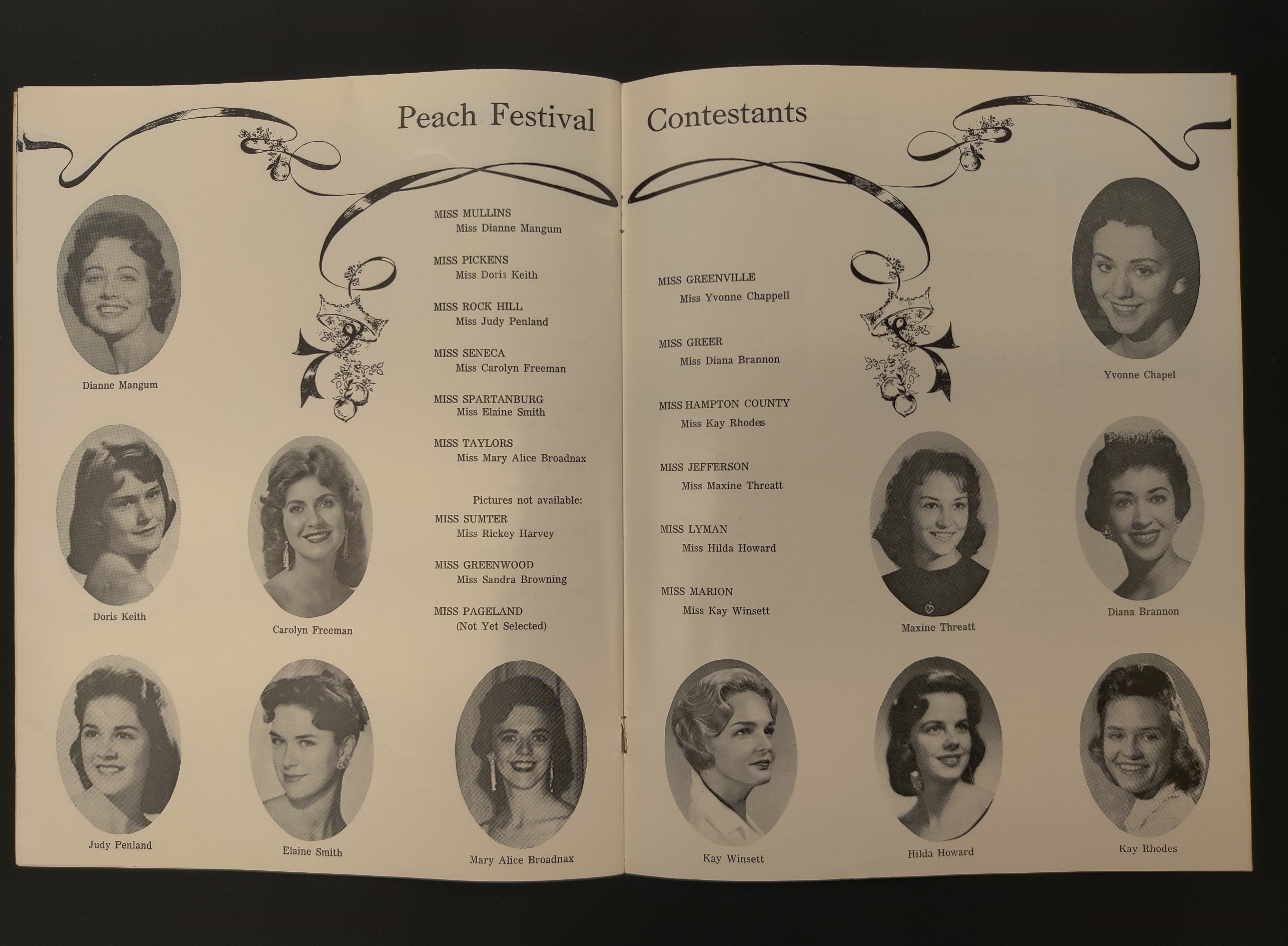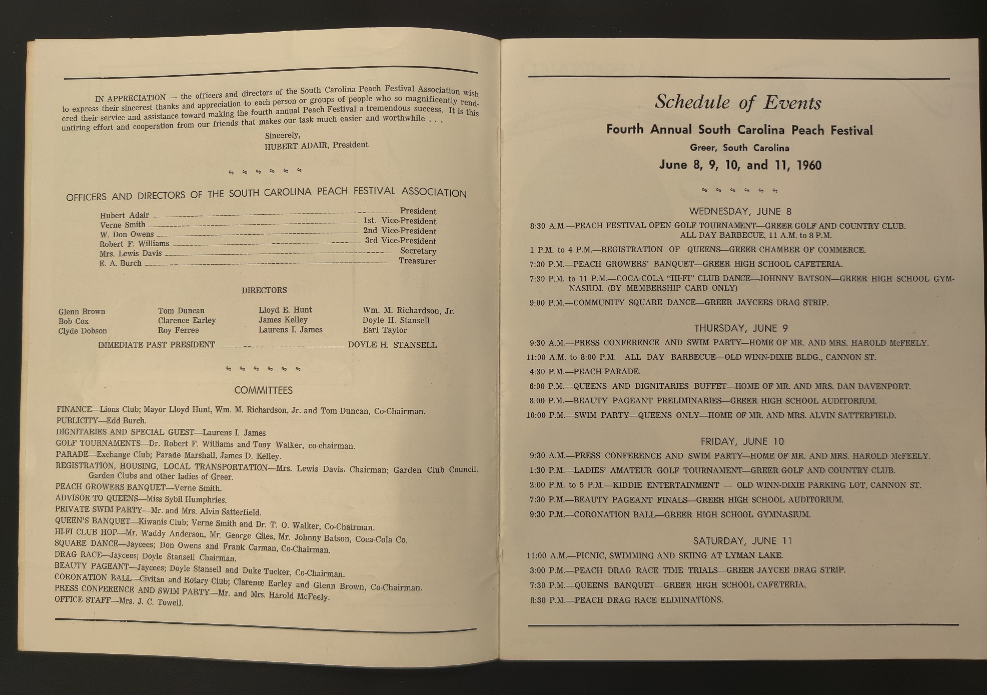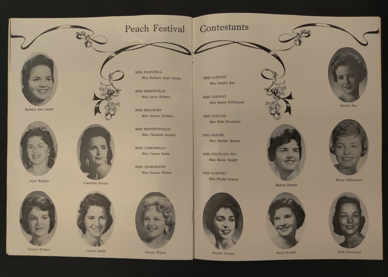 - A program for the 1960 Peach Festival including photographs of Peach Queens contestants, lists of committees and boosters, and a festival itinerary